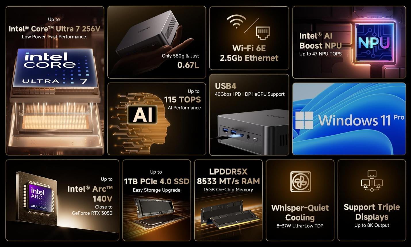 CHUWI, una marca tecnológica global reconocida por ofrecer dispositivos informáticos de alto rendimiento a precios accesibles, anunció hoy el AuBox X, un mini PC con AI ultracompacto impulsado por los últimos procesadores Intel® Core™ Ultra (Serie 2, Lunar Lake). Diseñado para la emergente era de los PC con AI, el AuBox X integra una potente aceleración de AI local, conectividad moderna y un funcionamiento sumamente silencioso en un formato ultracompacto de 0,67 litros que cabe en la palma de la mano.