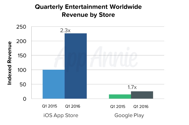 En el terreno de la música, la plataforma de Apple sigue consiguiendo ingresos muy por encima de Google Play (igualmente unas diez veces más), aunque curiosamente, Android supera a iOS en lo que respecta al crecimiento de ingresos en servicios de streaming musicales con un aumento de un 180 por ciento, frente a un 160 por ciento en iOS.