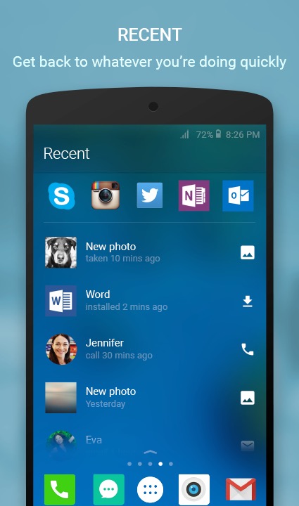 La estructura de la lanzadera se basa en cuatro pantallas principales. La primera con las apps que más usas, que además puede aprender del uso que haces del móvil e ir dejando en esta pantalla de inicio las apps a las que dedicas más tiempo. Por supuesto esta pantalla es editable y puedes añadir u ocultar las apps que desees. La segunda pantalla es la de personas, para acceder rápidamente a los contactos frecuentes y tienes después una pantalla de recordatorios y otra de elementos recientes de todo tipo: fotos, descargas, llamadas perdidas, etc.