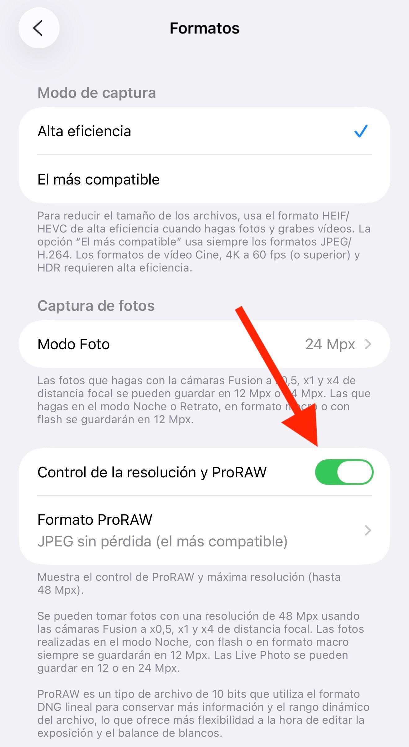Para activar el formato RAW (o ProRAW en los modelos Pro), sigue estos pasos: