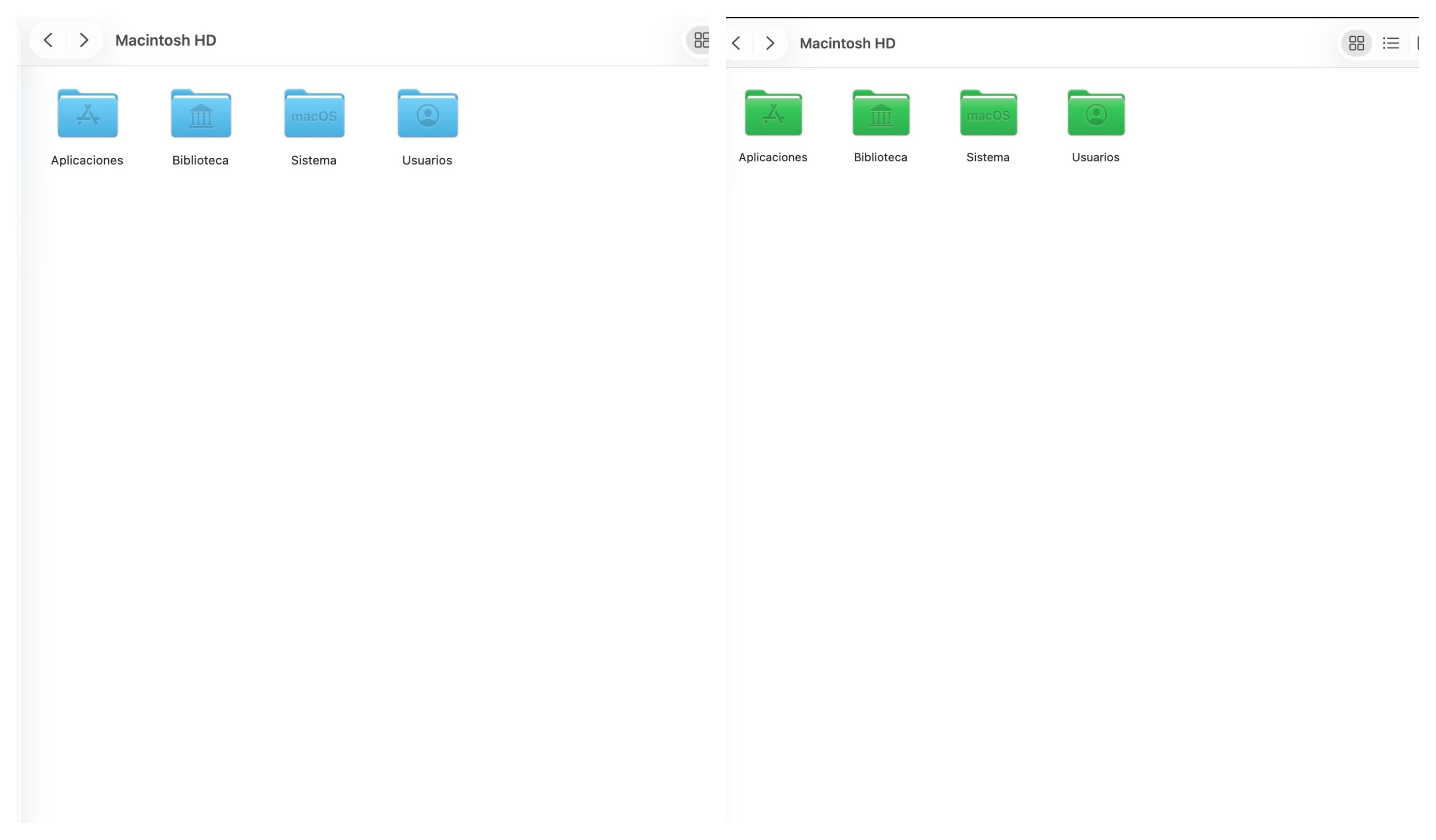 Vuelve al Finder y abre Macintosh HD o cualquier carpeta. Verás que los iconos han actualizado su color. Este cambio no afecta al contenido ni a la estructura del sistema, solo a la estética, así que puedes cambiarlo tantas veces como quieras sin riesgo.
