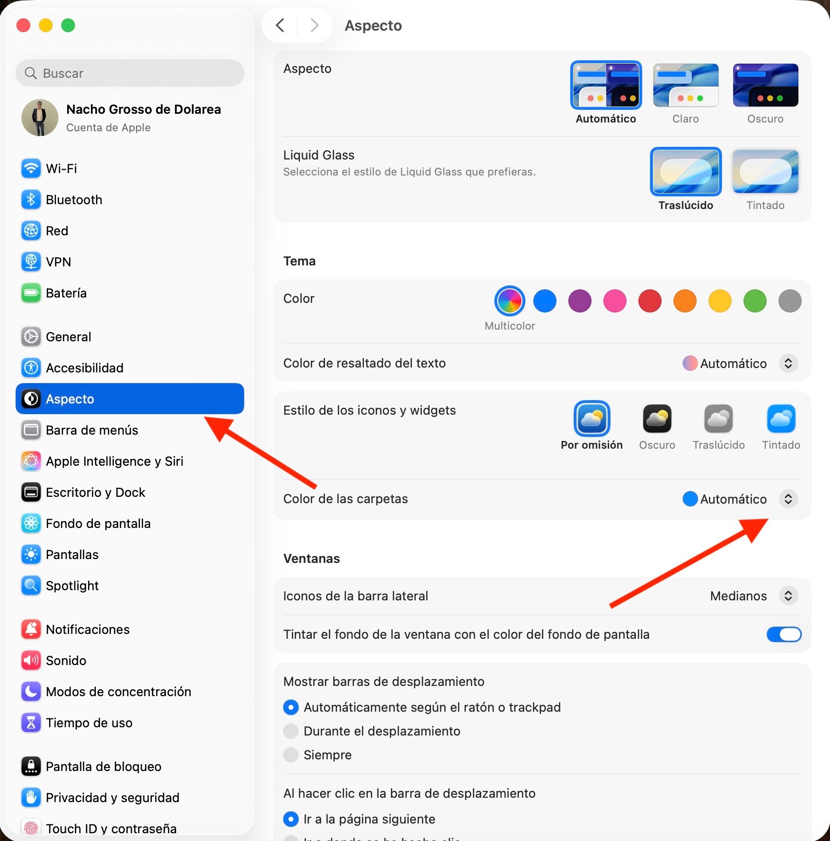 Una vez dentro de los ajustes, verás un panel lateral lleno de categorías. La que buscas es Aspecto. Esta sección reúne todo lo relacionado con el tema del sistema, los colores y el estilo de los iconos. Al abrirla encontrarás opciones como el estilo de Liquid Glass, el color del sistema, el estilo de los widgets y, justo donde nos interesa, el apartado Color de las carpetas.