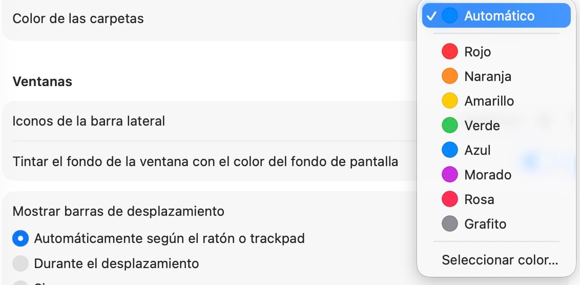 Dentro de Color de las carpetas, verás que por defecto aparece la opción Automático, que es color azul que tienen por defecto. Si despliegas el menú, tendrás disponibles colores como rojo, naranja, amarillo, verde, azul, morado, rosa o grafito.