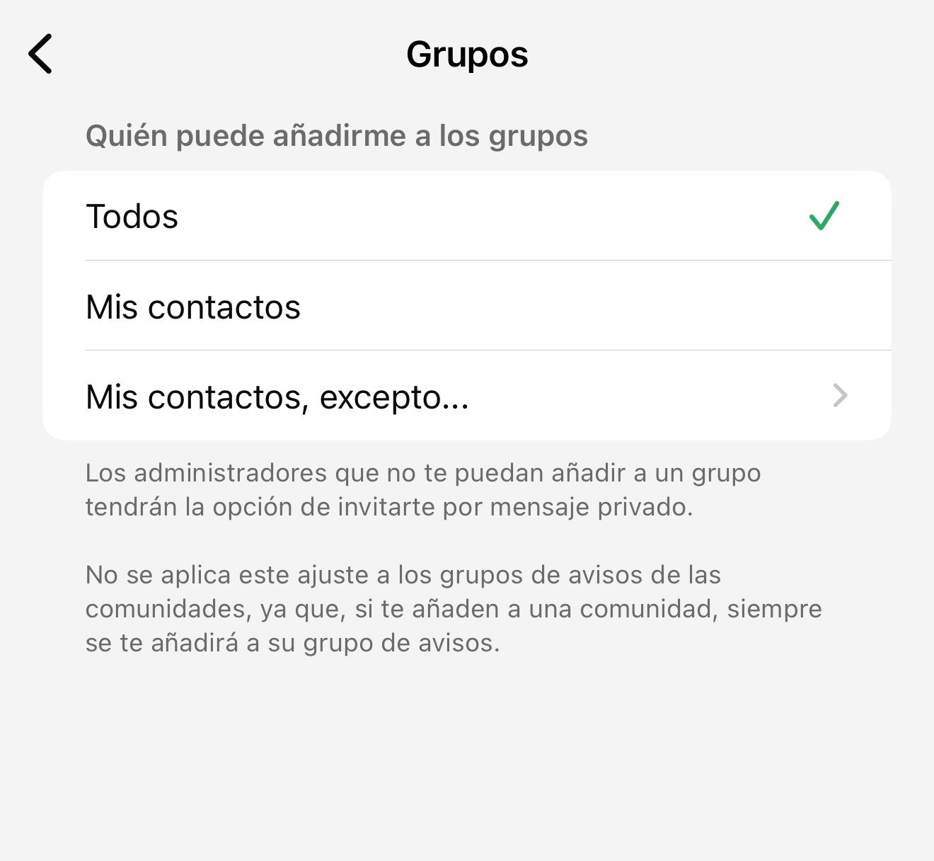 Todo se gestiona desde el apartado de privacidad de WhatsApp, donde puedes elegir entre permitir que cualquiera te agregue, limitarlo solo a tus contactos o bloquear casos concretos. Es una función discreta, pero extremadamente útil para mantener tu cuenta bajo control.