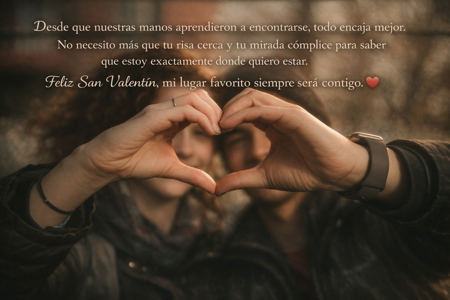 “Quiero crear una postal de San Valentín para mi pareja. En la foto estamos sentados en un banco, riendo después de una cena. Escríbeme un texto de entre 60 y 80 palabras, emotivo pero natural, que transmita complicidad y gratitud. Evita frases demasiado cursis.”