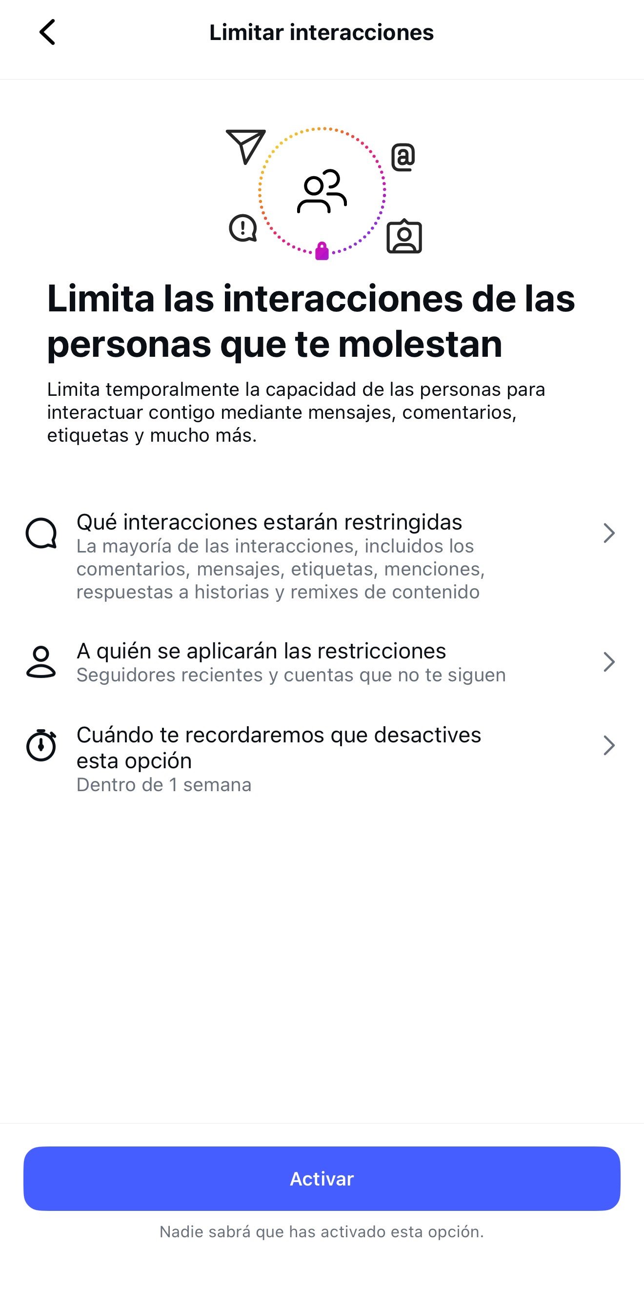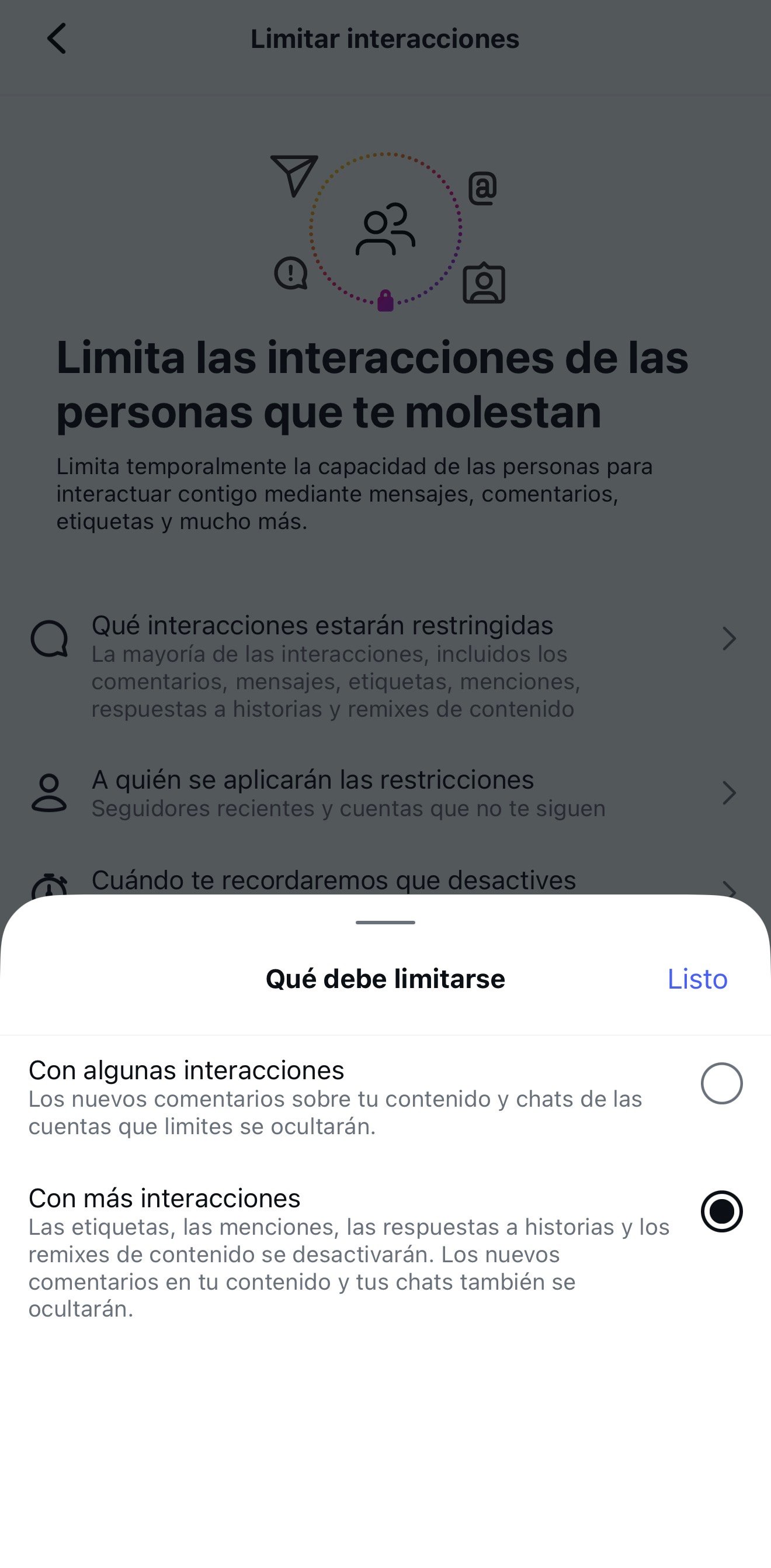 La plataforma permite elegir entre dos niveles principales. Con algunas interacciones se ocultarán los nuevos comentarios sobre tu contenido y los chats de las cuentas que limites. Es una opción más suave, pensada para reducir molestias sin cerrar completamente la puerta.