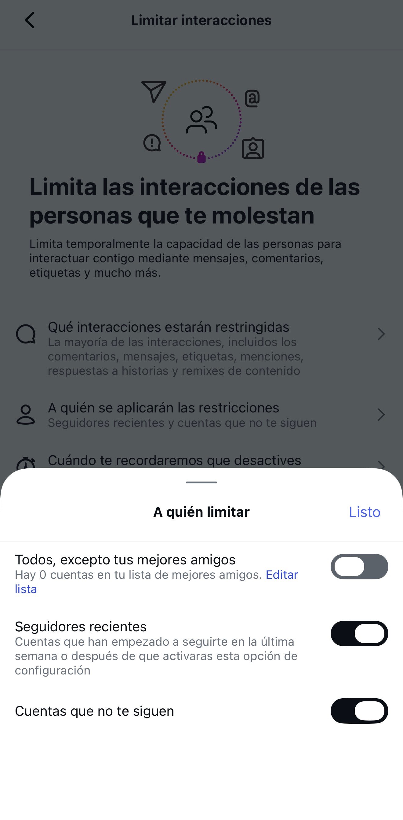 También puedes limitar a cuentas que no te siguen. En muchos casos, las molestias proceden de perfiles que no forman parte de tu comunidad habitual. Existe además la posibilidad de aplicar la limitación a todos excepto tus mejores amigos, si utilizas esa lista. Así mantienes una adecuada comunicación con tu círculo cercano mientras reduces la exposición pública.