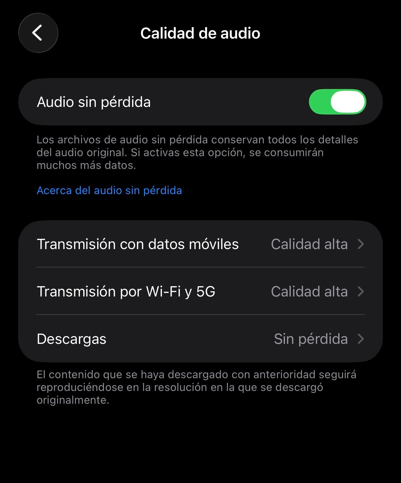 En iPhone y iPad, el ajuste se encuentra en Ajustes, dentro del apartado Música. Desde ahí hay que entrar en Calidad de audio y activar la opción de audio sin pérdida. El sistema permite elegir una calidad distinta para streaming y para descargas, algo útil si quieres ahorrar datos móviles.