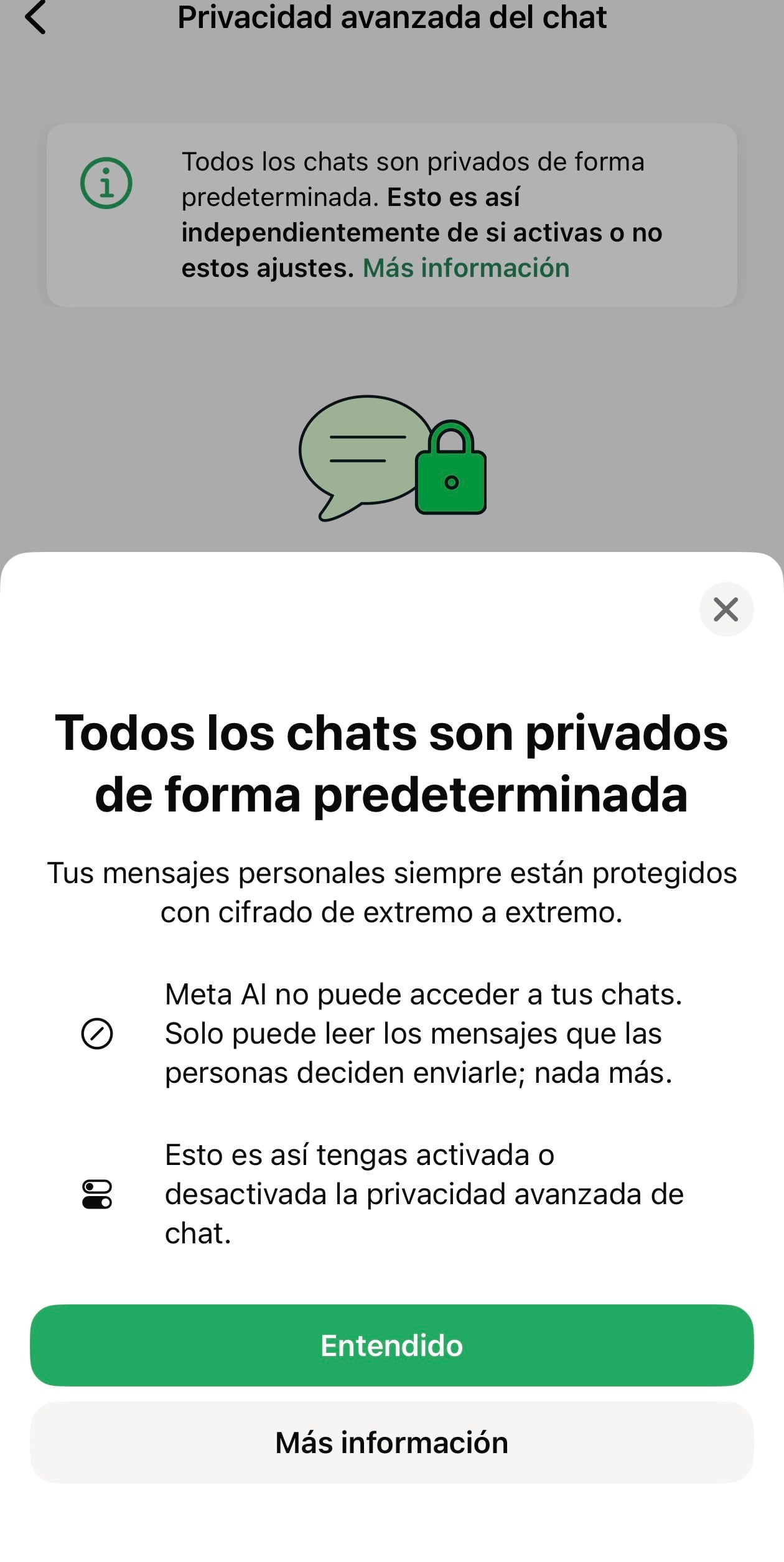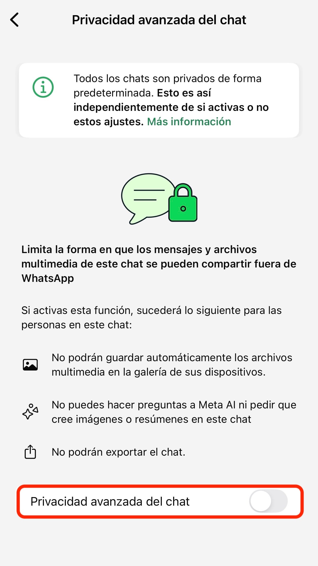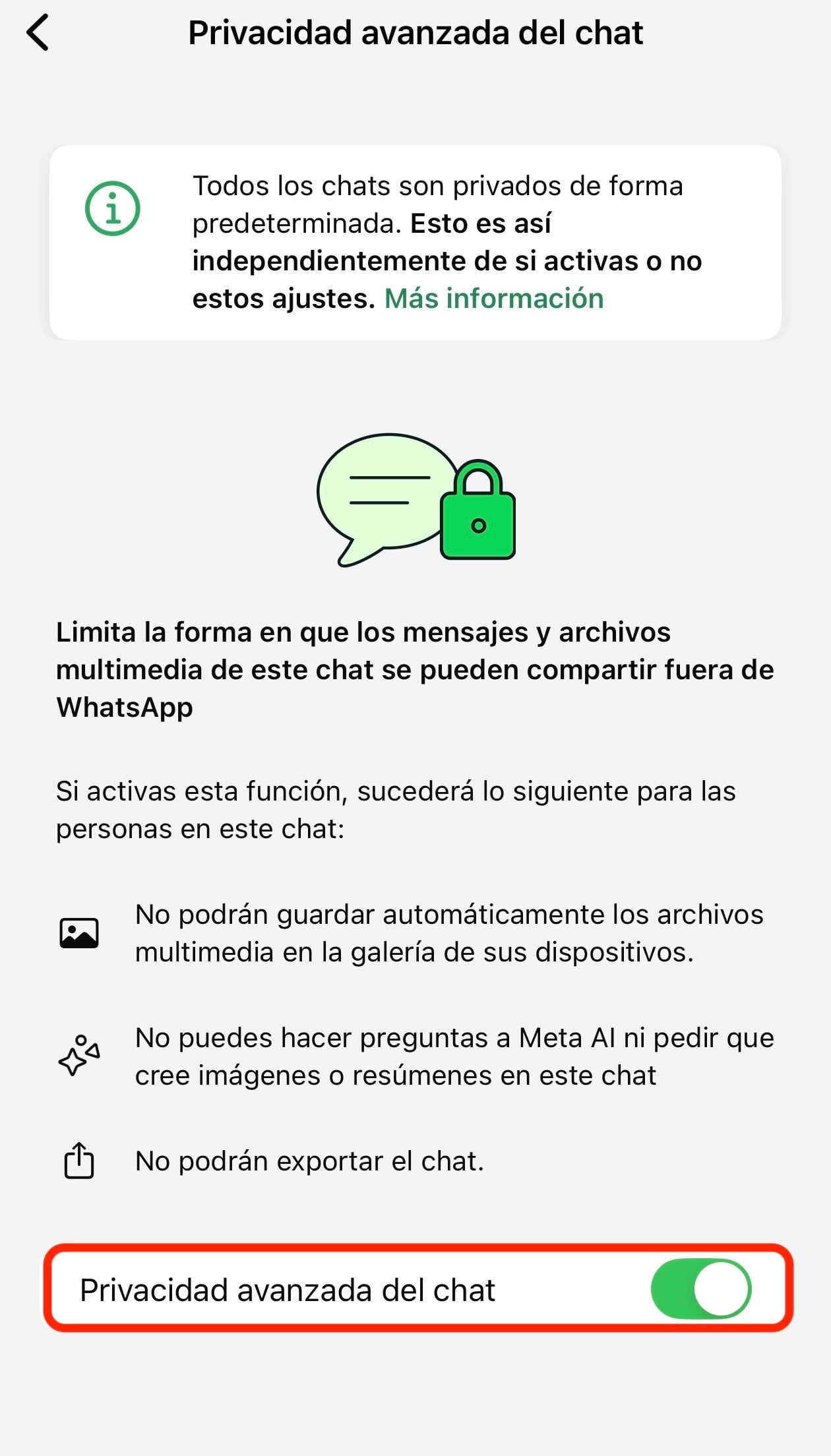 Al entrar, WhatsApp enseña una pantalla en la que explica que todos los chats ya son privados de forma predeterminada, pero que esta opción limita aún más cómo pueden compartirse mensajes y archivos multimedia fuera de la app.
