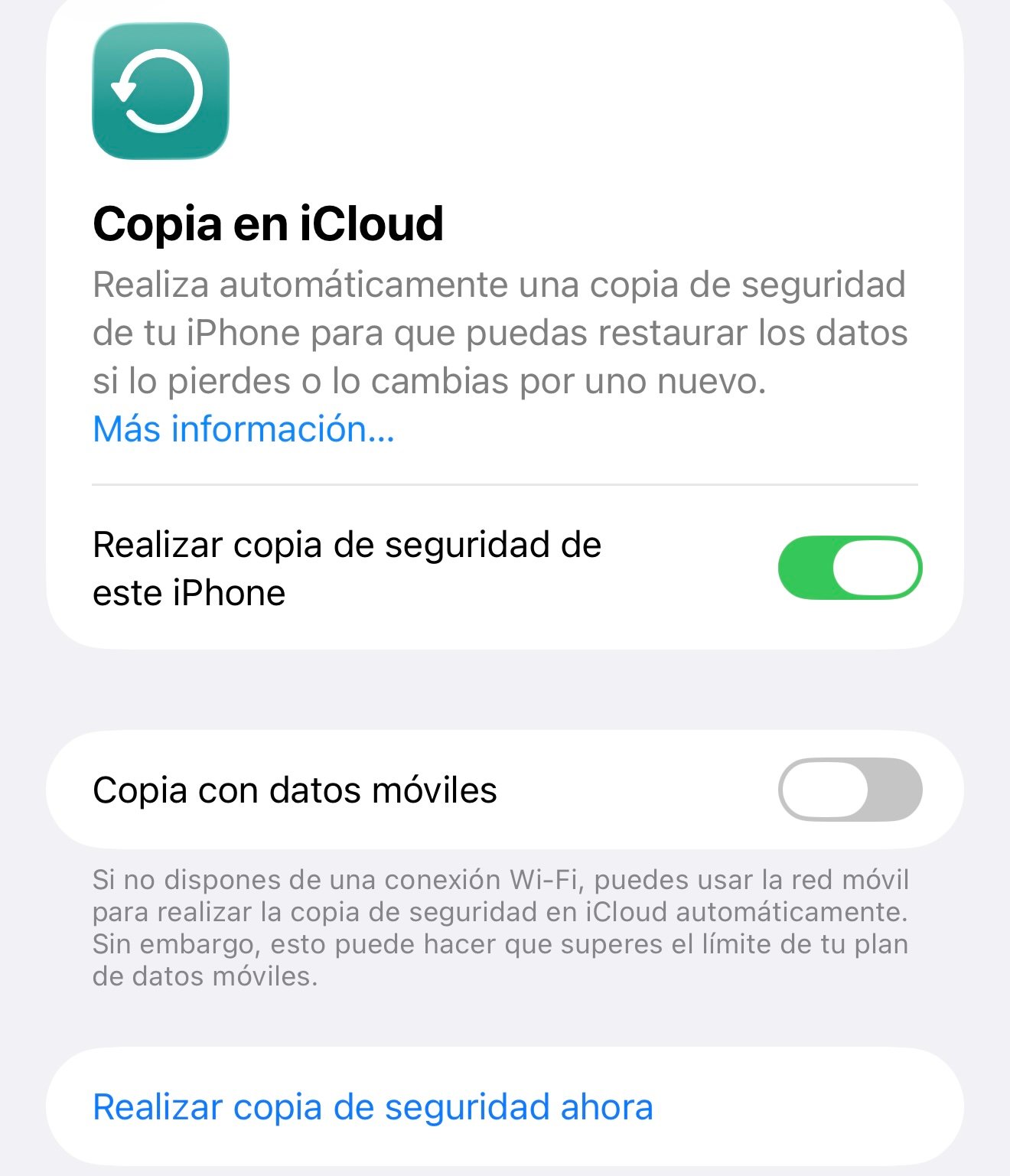 Antes de hacer cualquier cambio, conviene asegurarse de que el iPhone cuenta con una copia de seguridad reciente. Es el paso más importante del proceso y el que marca la diferencia entre un susto y una recuperación sin sobresaltos. Desde Ajustes, tocando en tu nombre y entrando en iCloud, puedes comprobar cuándo se hizo la última copia.