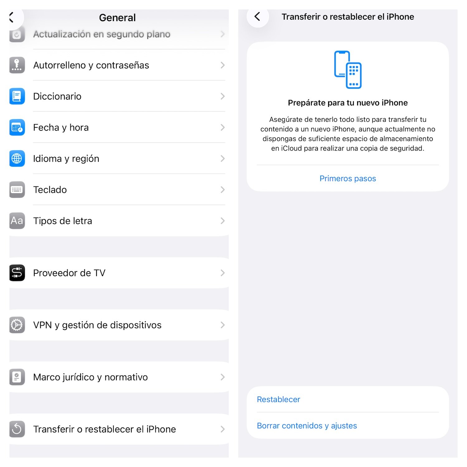 Si el objetivo es más profundo, por ejemplo dejar el iPhone completamente limpio pero conservar toda la información después, entonces sí es necesario borrar contenidos y ajustes. En este caso, el sistema guía paso a paso para confirmar que existe una copia de seguridad reciente antes de continuar.