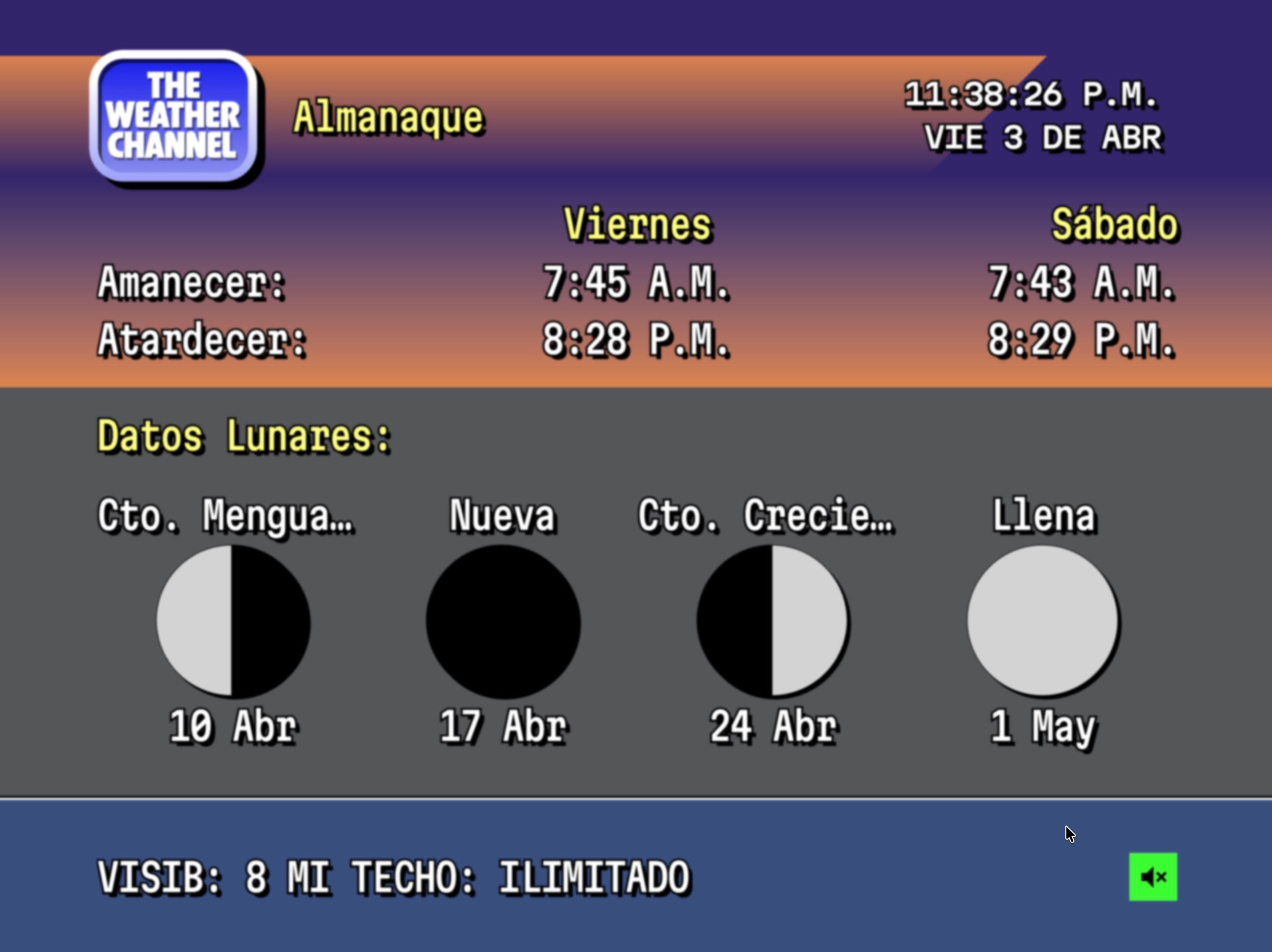 Una vez dentro, el panel principal permite alternar entre diferentes pantallas de información. La sección de condiciones actuales muestra de forma esquemática la sensación térmica y la presión barométrica, mientras que el panel denominado Almanaque ofrece detalles astronómicos de gran utilidad, como las horas exactas del amanecer y el atardecer o las próximas fases lunares. El usuario tiene la posibilidad de cambiar las unidades de medida entre el sistema métrico y el imperial, además de controlar el audio ambiental mediante un icono situado en la parte inferior de la pantalla.