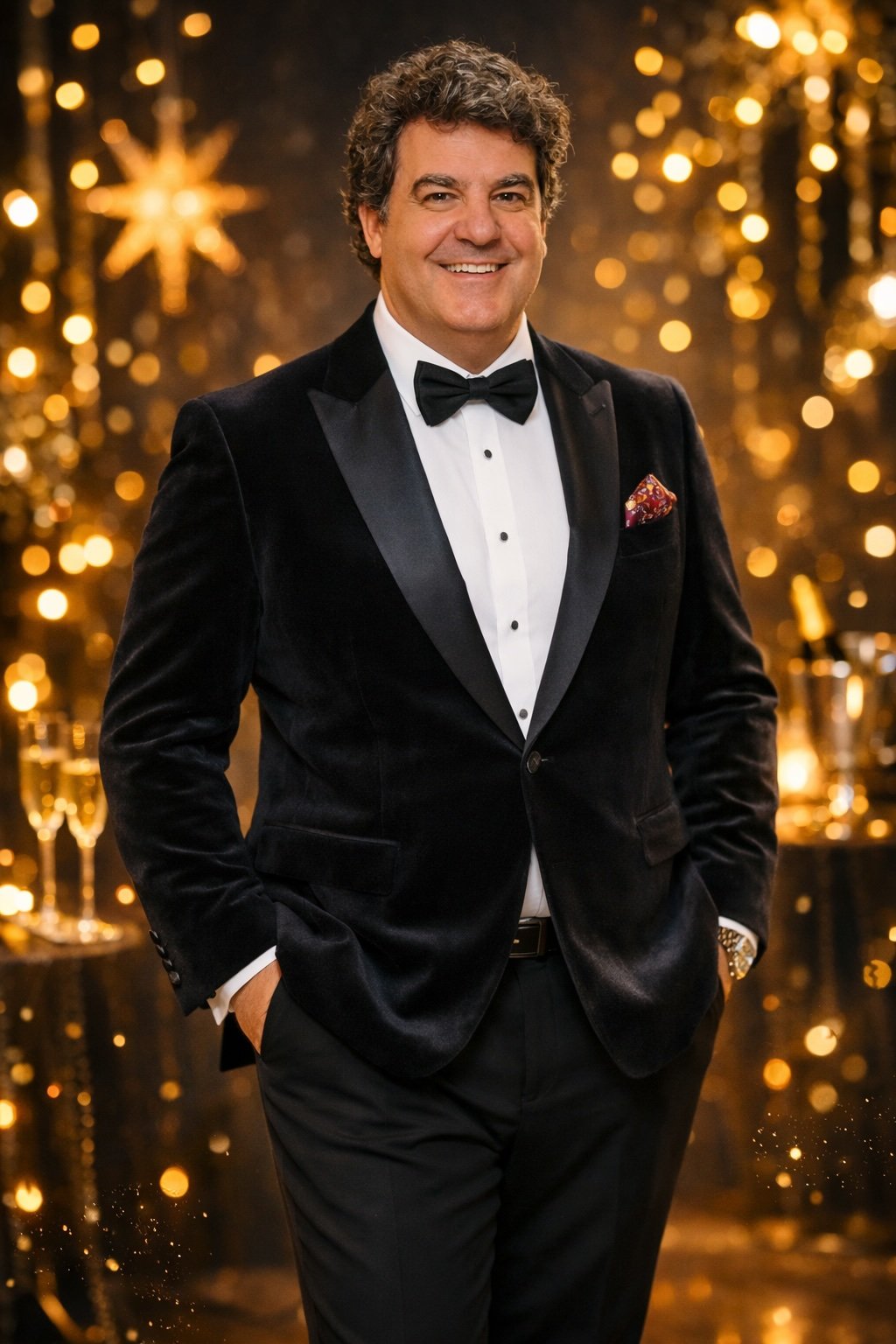 Retrato fotográfico hiperrealista de un hombre adulto elegante, de cuerpo entero, sonriente y con actitud cercana y positiva. Viste traje de fiesta moderno y bien entallado, con chaqueta oscura, camisa clara y detalles sofisticados acordes a una celebración de Nochevieja. La postura es natural y relajada, ligeramente de tres cuartos, transmitiendo confianza y optimismo. El fondo es festivo y nocturno, con luces cálidas, destellos dorados, decoración elegante y un ambiente de celebración de Año Nuevo, sin resultar recargado. Iluminación profesional, estilo fotografía editorial, alta calidad, colores equilibrados, aspecto realista y natural, ideal para una tarjeta o felicitación de Año Nuevo.
