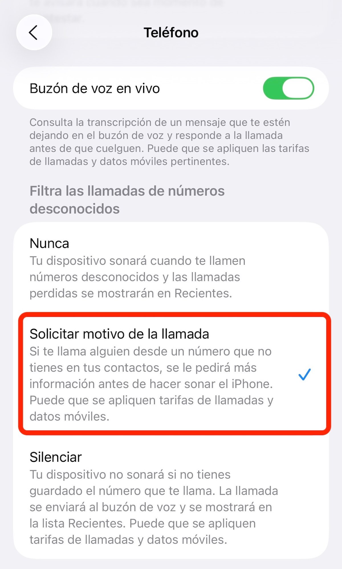 Esta nueva función se encuentra dentro de los Ajustes del iPhone, en la sección Teléfono, y permite elegir entre tres modos: Nunca, Solicitar motivo de la llamada o Silenciar.