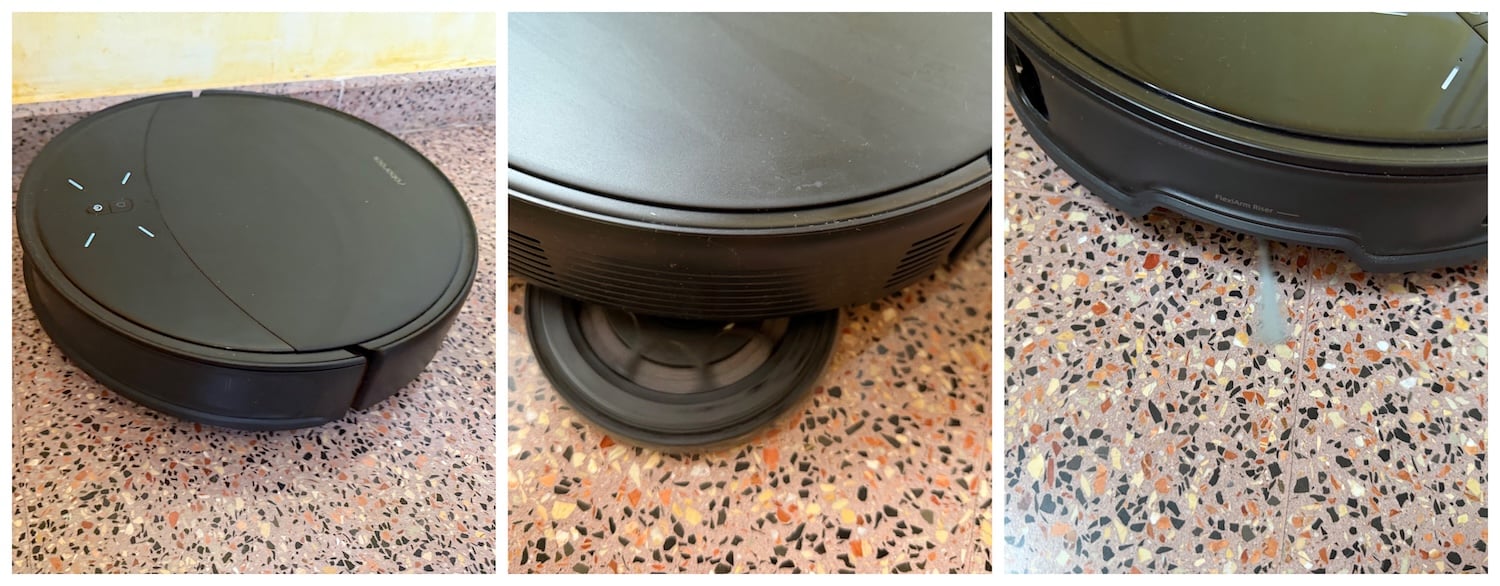 Esta flexibilidad se completa con su sistema de cuatro elementos elevables: chasis, cepillo principal, cepillo lateral y mopa, cada uno de los cuales se ajusta automáticamente según la tarea (aspirar, fregar, moverse sobre alfombras o volver a la base). Es un avance que mejora el flujo de limpieza, evitando zonas húmedas en moquetas o bordes mal fregados.
