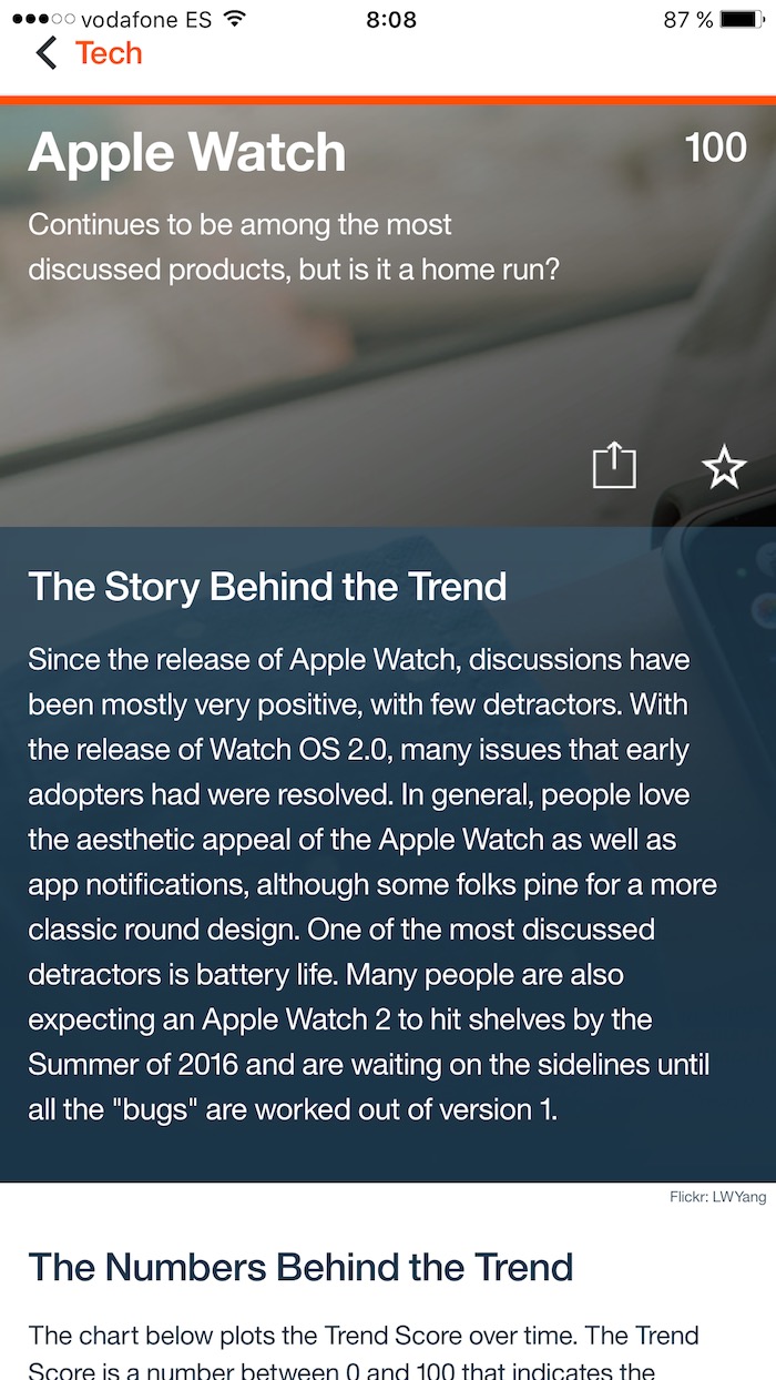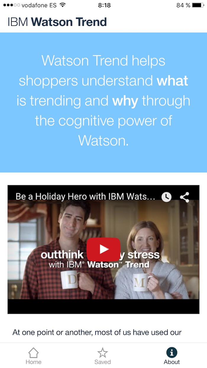En la versión actual de esta app Watson Trend, hay tres categorías de productos: tecnología, juguetes, y salud; y en cada una de ellas se listan los que se estiman van a ser más populares. Además, en cada uno de los productos seleccionados, se explica “la historia tras la tendencia” que muestra cómo se ha llegado a la conclusión, cómo ha evolucionado dicha tendencia e incluso comentarios extraídos de publicaciones en Internet o redes sociales que apoyan la selección. Así, es como si este Watson fuese capaz de absorber todo lo que se puede ver en Internet y procesarlo de manera inteligente para predecir qué va a ser más popular… y además, sin dejarse llevar por su opinión o sentimientos como haría cualquier humano (que quizá no tendrá tan claro recomendar un Apple Watch).