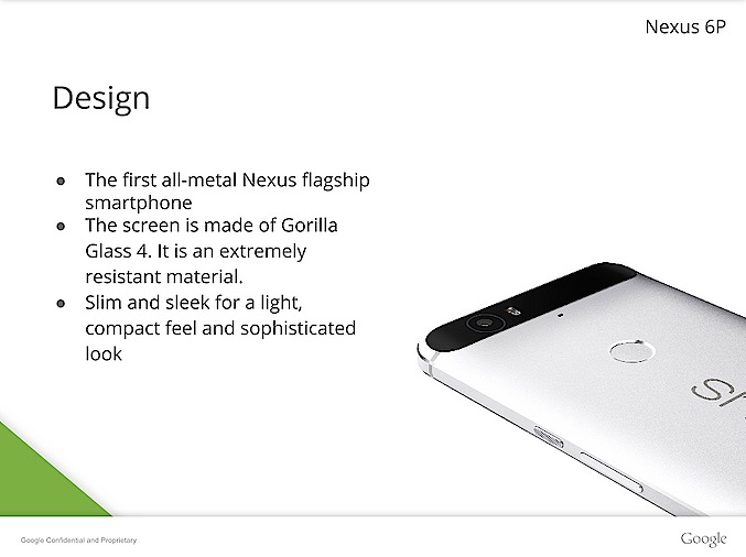 Lo mejor de esta serie de diapositivas es que dejan ver el terminal desde distintos ángulos y parece que el aspecto estético del Nexus 6P va a ser mejor de lo que podíamos esperar. Además, se confirman detalles interesantes, como que contará con la rumoreada pantalla de 5,7 pulgadas con resolución QHD y que ésta irá además protegida por cristal Gorilla Glass 4, el más resistente los que fabrica Corning.