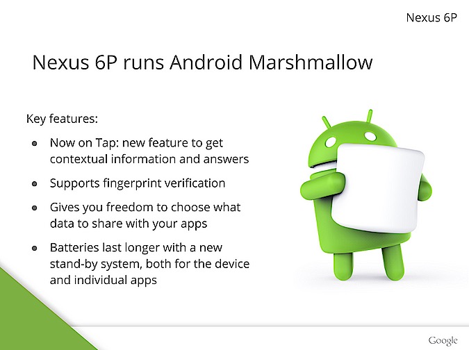 Por último, también se hace énfasis en las prestaciones del nuevo sistema Android 6, Marshmallow, que permitirá configurar los permisos de cada aplicación, conseguirá una mayor autonomía y tiene novedades en Google Now como la prestación “Now on Tap”. Esta característica ofrece información según el contexto y te permite, por ejemplo, si estás viendo un trailer de una película y pulsas y mantienes el botón de home, que Google Now te proporcione información sobre ella.