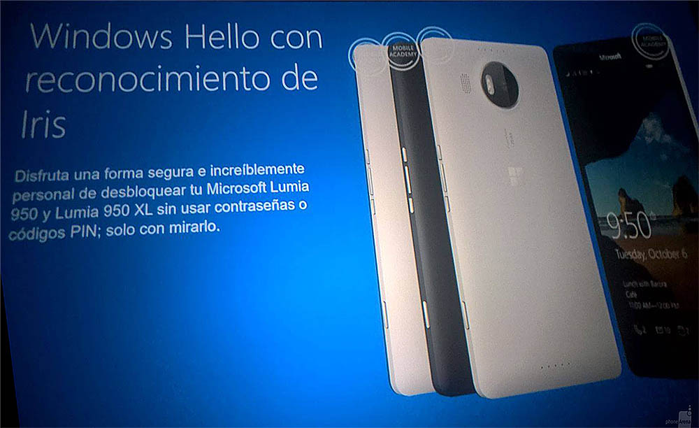 Por si quedaban dudas del aspecto qué tendrán o las características de los Lumia 950 y Lumia 950 XL que se espera Microsoft presente el próximo 6 de octubre, hoy se han filtrado una buena selección de diapositivas de presentaciones de marketing o prensa que traen muy buenas noticias para los aficionados a los teléfonos Windows ya que los nuevos terminales son tan impresionantes como se rumoreaba. Las imágenes han sido filtradas por distintos sitios web de aficionados a Nokia y Windows y dejan ver no sólo el exterior de los nuevos Lumia sino algunas prestaciones tan interesantes como el desbloqueo del terminal con la mirada, usando la autenticación biométrica Windows Hello y reconocimiento del iris.