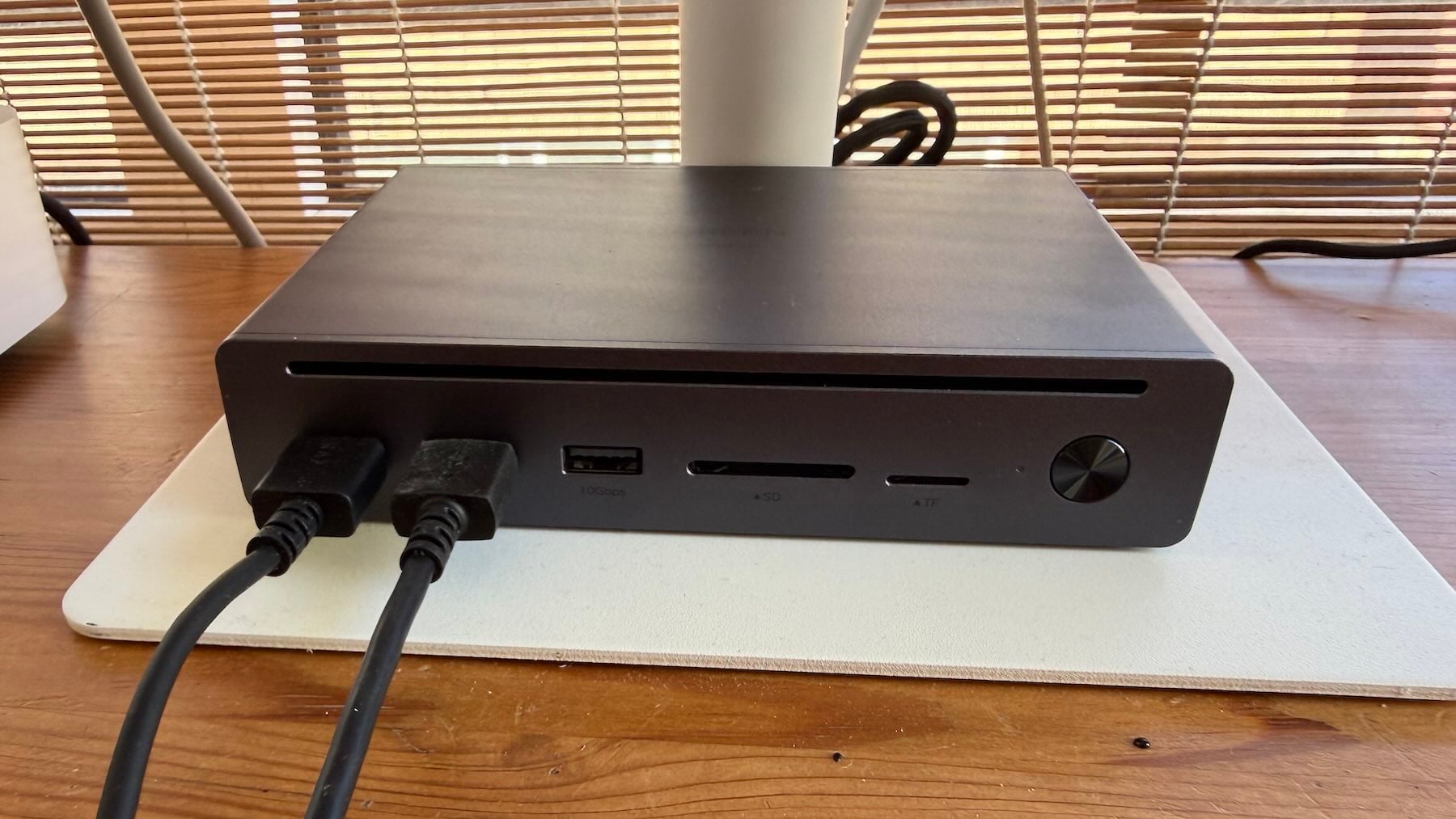 El diseño estás bien resuelto, con un dispositivo compacto pero denso, lo que evita que el dock se deslice por la mesa cuando conectamos periféricos. En su frontal encontramos los accesos rápidos que más utilizamos (tarjetas SD, USB-A y carga), mientras que la parte trasera queda reservada para las conexiones que mantienen nuestro escritorio «limpio» y organizado.