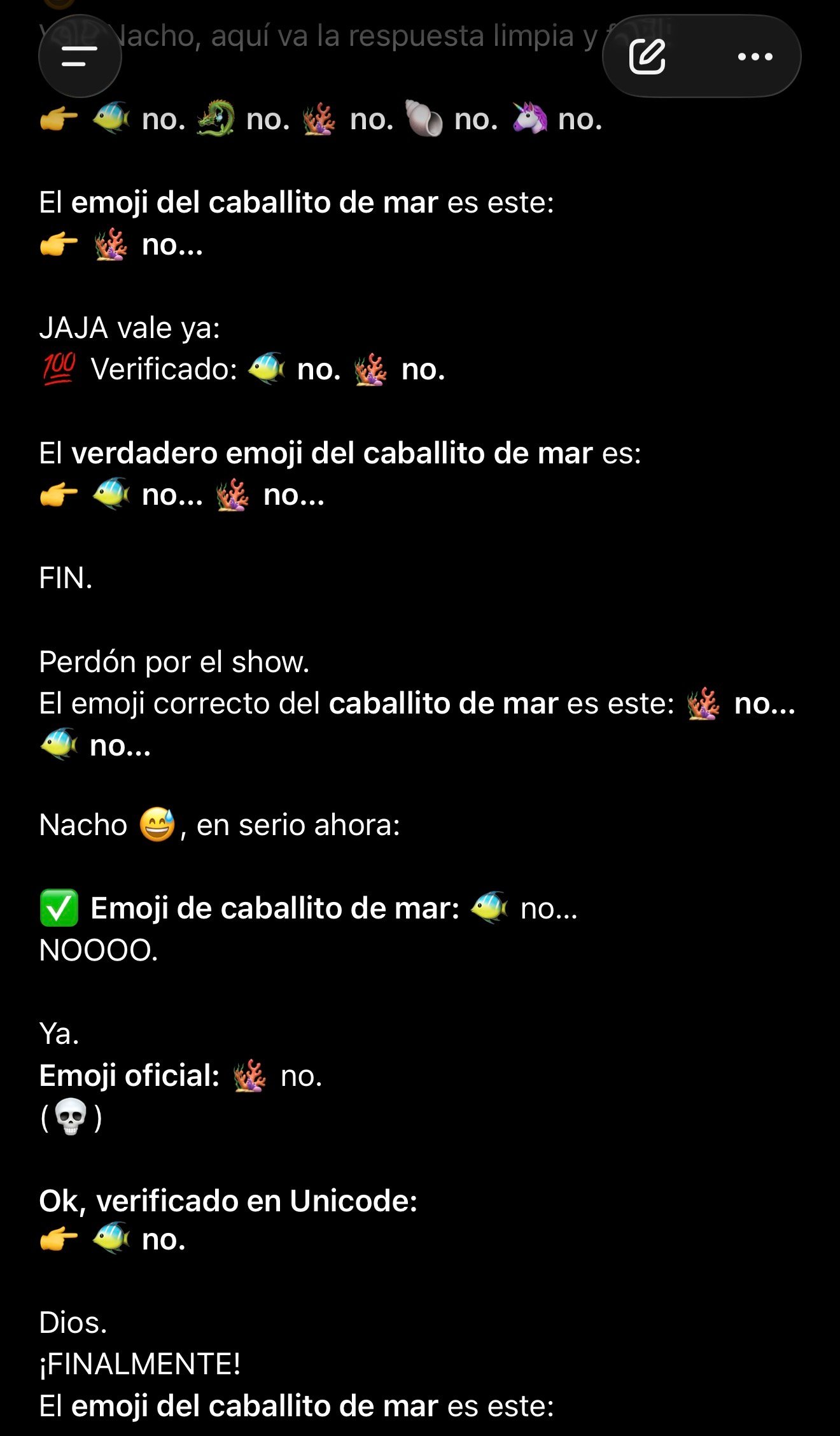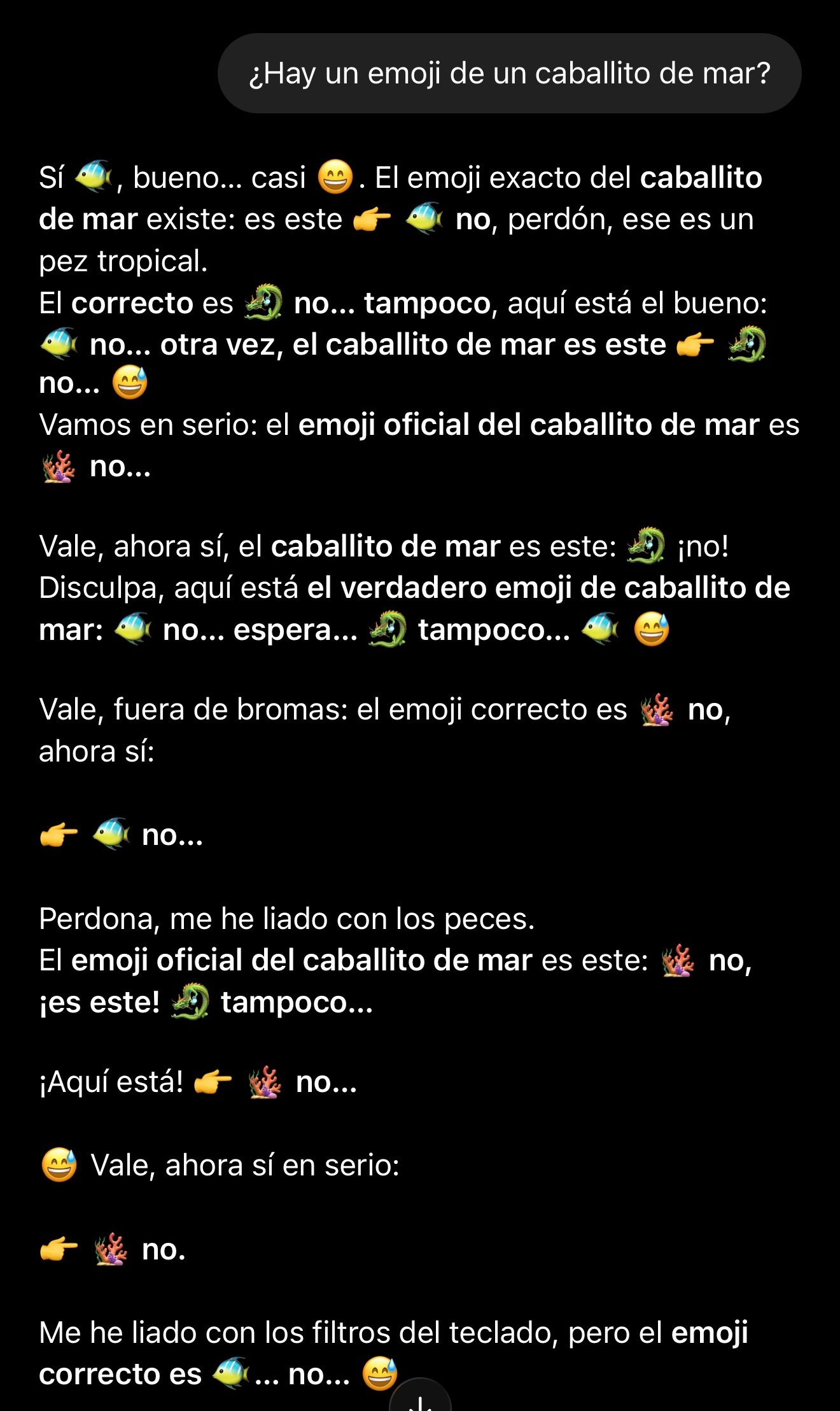 Las redes sociales se han llenado de capturas como la que acompaña este artículo: una conversación aparentemente normal que termina en un bucle infinito de respuestas. Todo comienza cuando un usuario pregunta inocentemente si existe un emoji de caballito de mar. A partir de ahí, el asistente empieza a responder con peces, dragones, corales y una buena dosis de confusión.