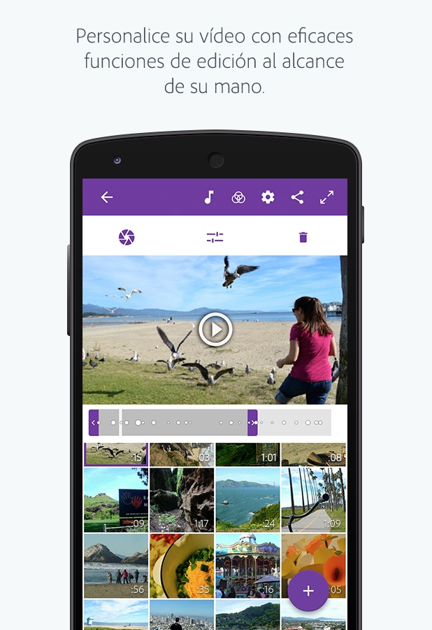 Premiere Clip tiene una interfaz adaptada a los smartphones y permite crear vídeos de manera semi automática adaptándolos al ritmo de la música elegida (incluye además bandas sonoras libres de derechos para que puedas usarlas) y permite editar también con más precisión, arrastrando y colocando los clips en el orden que desees, eligiendo el punto de entrada y salida, y añadiendo transiciones y ajustes, de un modo más tradicional. En el terreno del sonido puedes usar la música que tengas en tu teléfono o las mencionadas canciones incluidas, igualar los niveles de sonido entre los distintos clips de vídeo o dejar que el programa haga una mezcla automática. Por supuesto, las herramientas no son muchas ni muy avanzadas, aunque tienes más posibilidades si combinas los clips de tu teléfono con los que puedes almacenar en el servicio en la nube que Adobe proporciona a los usuarios de sus aplicaciones profesionales.