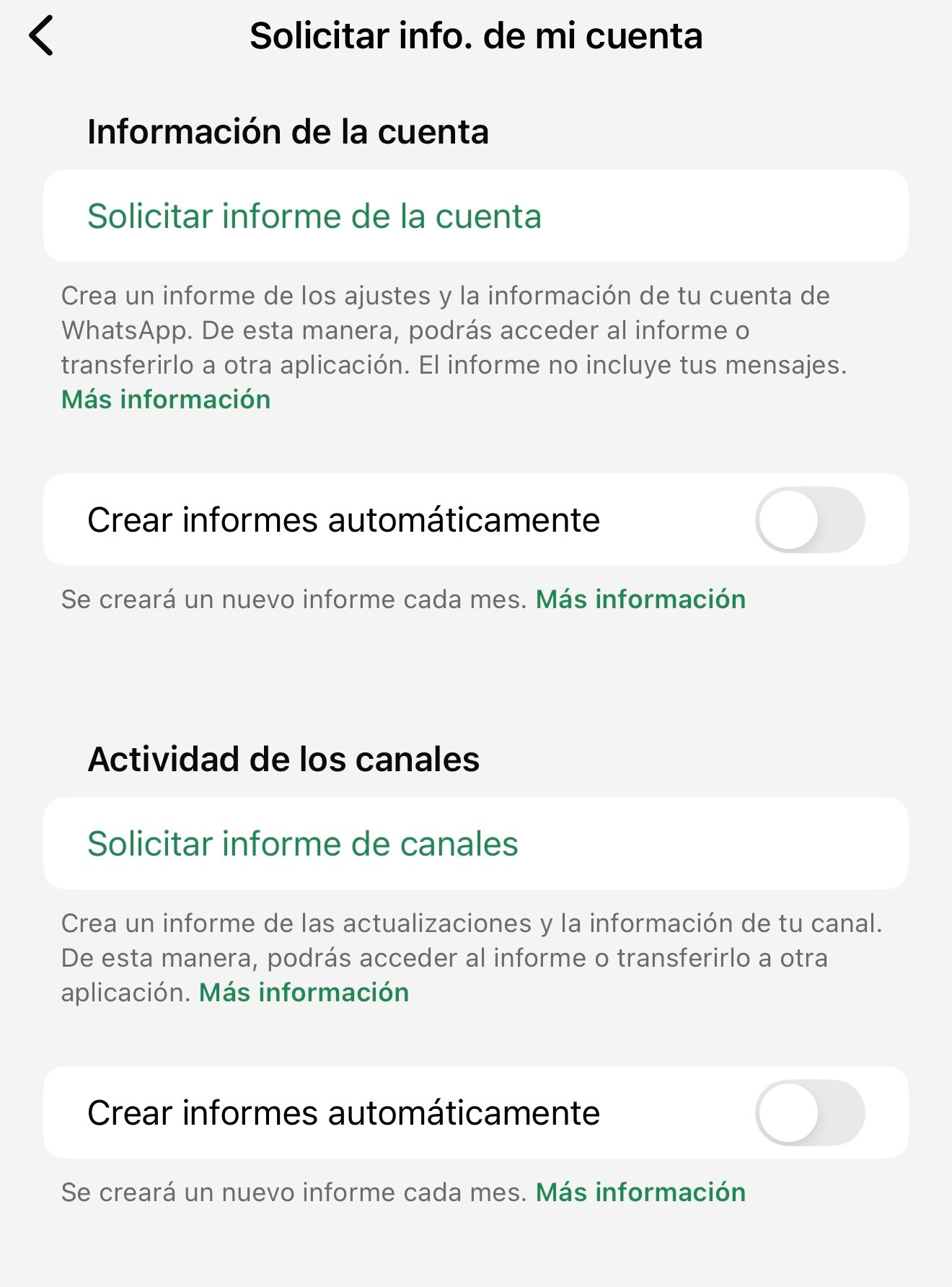 Solo hay que abrir Ajustes > Cuenta > Solicitar información de mi cuenta. Con un solo toque, podrás generar un informe que la app prepara en un plazo máximo de tres días. Cuando esté disponible, recibirás una notificación y podrás descargarlo en formato .ZIP, que contiene un archivo HTML con tus datos básicos y otro JSON para desarrolladores.