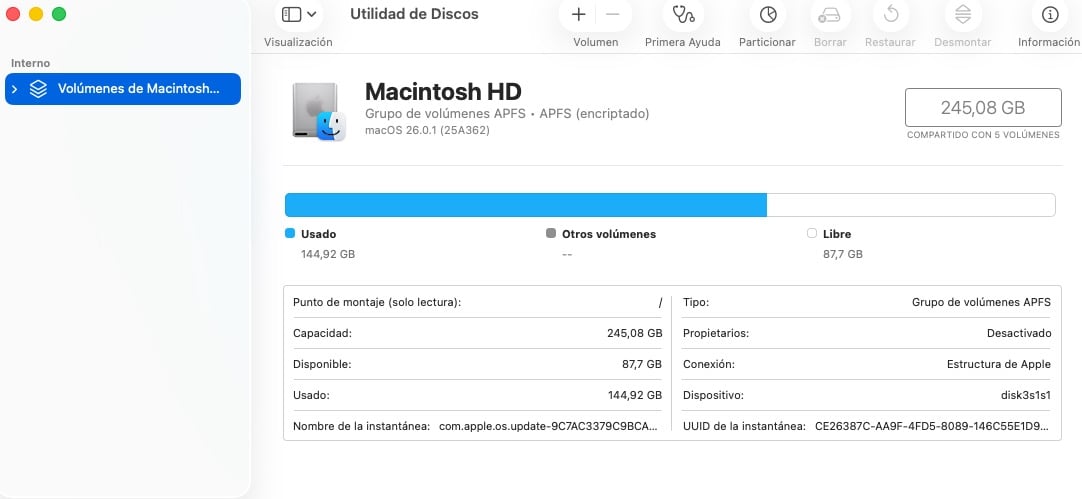 En macOS, el proceso es similar a través de Utilidad de discos. Ahí verás si el dispositivo está conectado aunque no se muestre en el Finder. Desde este menú puedes montar manualmente la unidad o, en caso de errores, ejecutar la opción Primera ayuda, que intenta reparar la unidad para que vuelva a funcionar con normalidad.