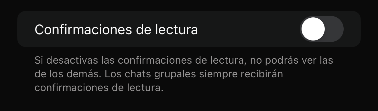El siguiente paso es desactivar las confirmaciones de lectura, que son los famosos checks azules. Dentro del mismo menú de Privacidad, desmarca la opción “Confirmaciones de lectura”. De ese modo, tus contactos no sabrán si has leído un mensaje. Eso sí, tú tampoco podrás ver cuándo leen los tuyos, salvo en los chats de grupo, donde las confirmaciones siguen activas por diseño.