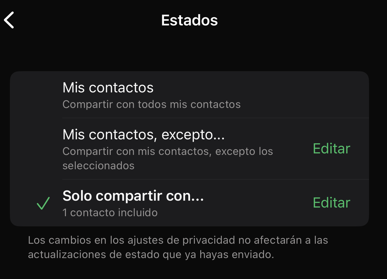 Por último, entra en Privacidad > Estado y elige quién puede ver tus actualizaciones. Si quieres mantener un perfil discreto, selecciona “Mis contactos excepto…” o “Solo compartir con…”. Así podrás publicar historias sin que todos sepan cuándo las subes.