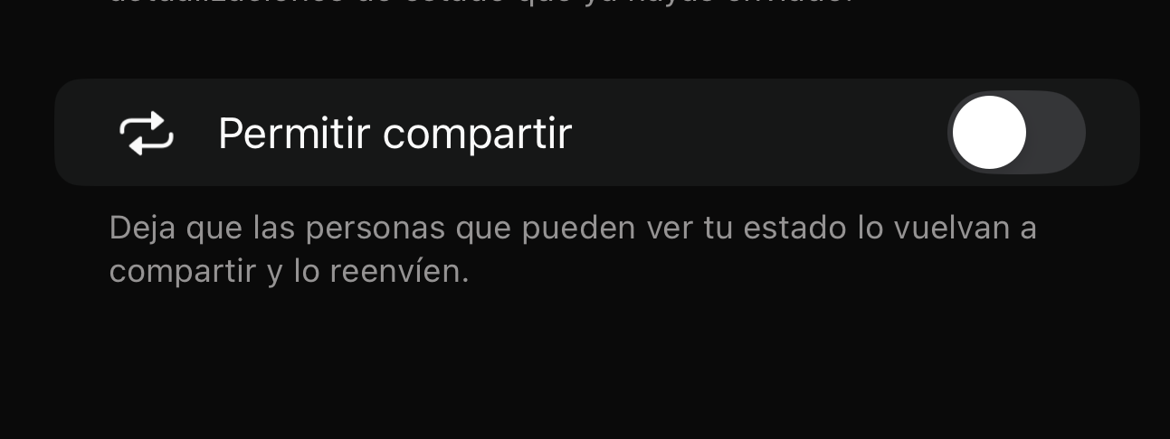 Hablando de Estados, hay una reciente adición que permite que alguien pueda compartir tu estado y reenviarlo. Cerciórate de que lo tienes desactivado, aunque viene así por defecto.