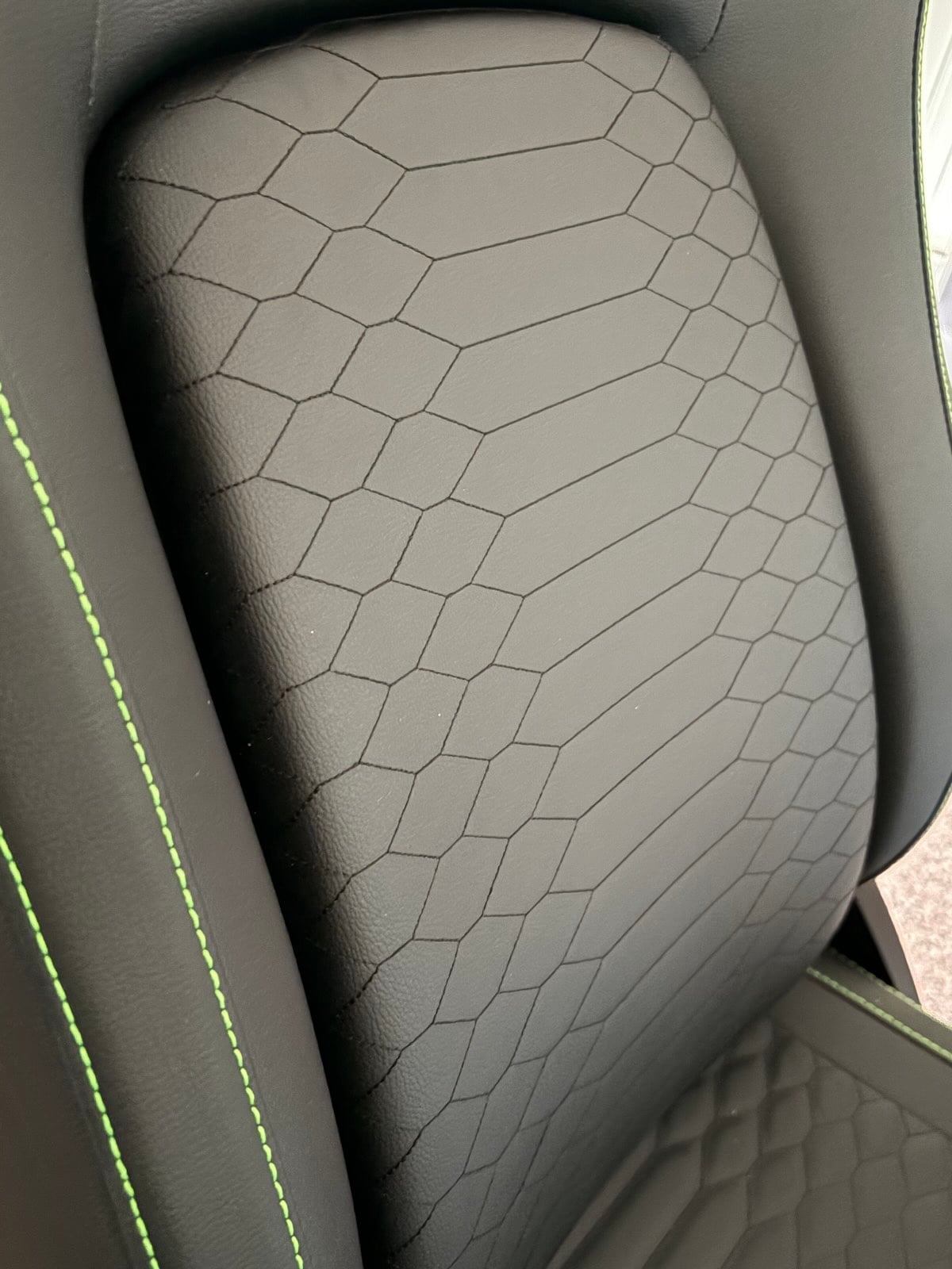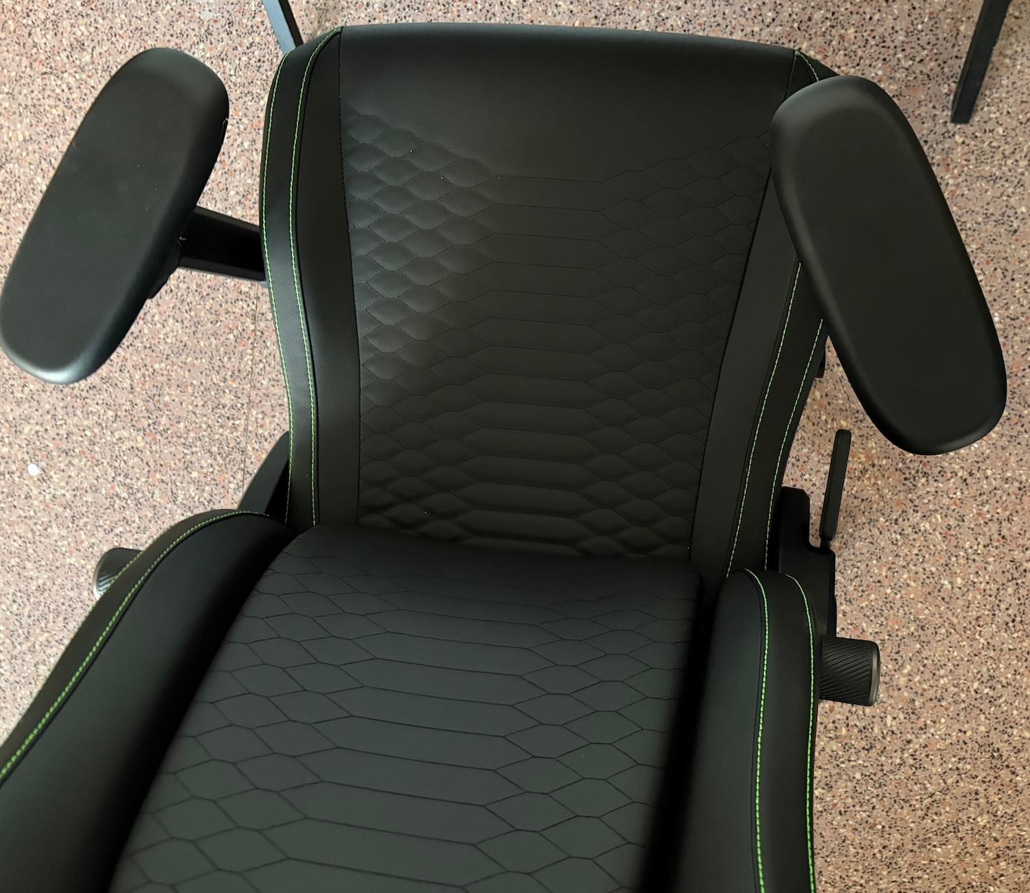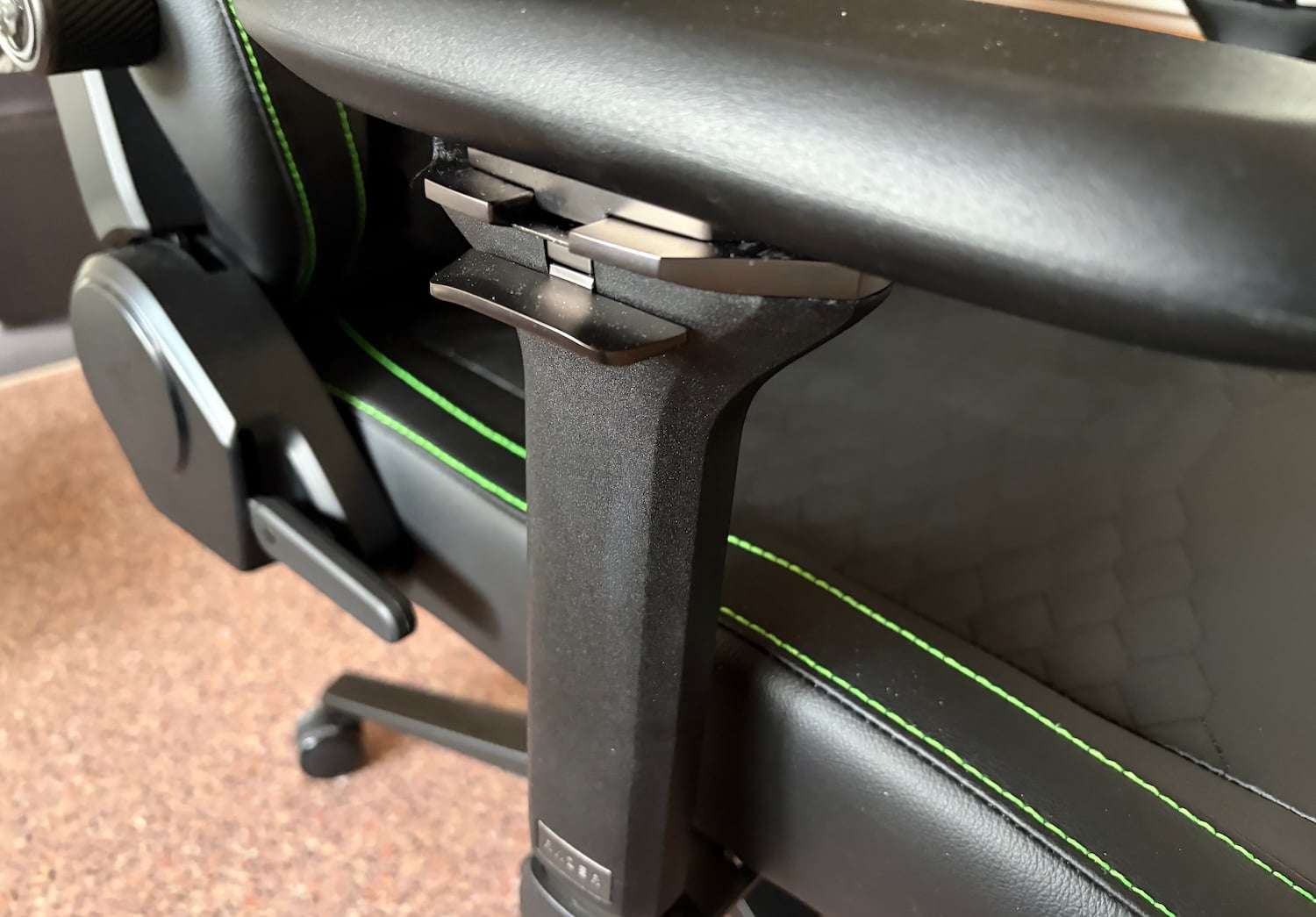 La primera impresión es la de un producto muy cuidado. El tapizado tiene un grano visible, el acabado en negro es sobrio y las costuras verdes aportan ese toque Razer sin convertir la silla en algo excesivamente llamativo. El patrón geométrico del asiento y del respaldo le da personalidad, pero también ayuda a romper la sensación de superficie lisa que suelen tener muchas sillas gaming.