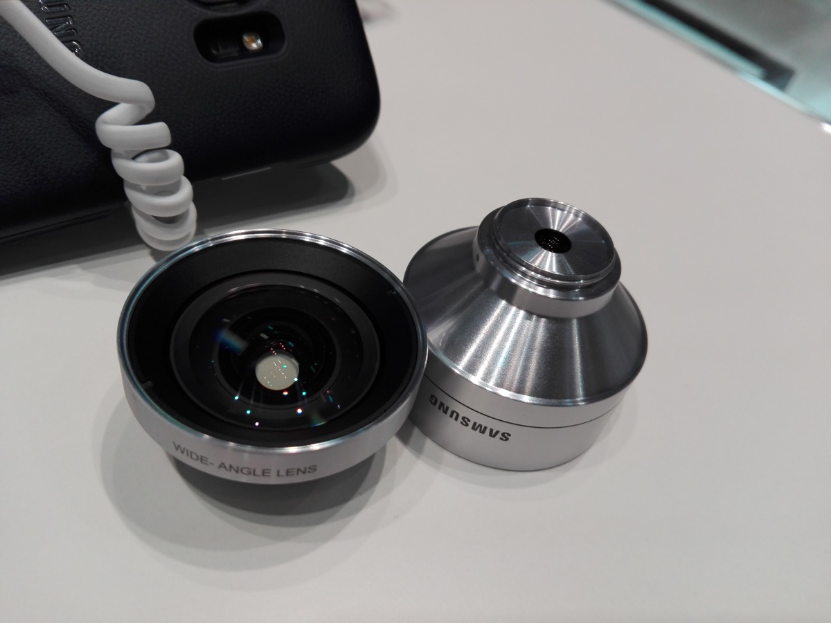 El accesorio más llamativo son posiblemente las carcasas con lentes accesorias de la propia Samsung para los Galaxy S7 y S7 edge, las llamadas Lens Cover. Estas carcasas llevan una rosca en la que se acopla un objetivo de generoso tamaño que amplia las posibilidades de la cámara. Una de las lentes es un gran angular que amplia el ángulo a 108 grados, mientras que el otro objetivo multiplica la distancia focal por dos (es como una ampliación 2x) y es ideal para retratos o fotos en las que el angular no es le mejor opción.