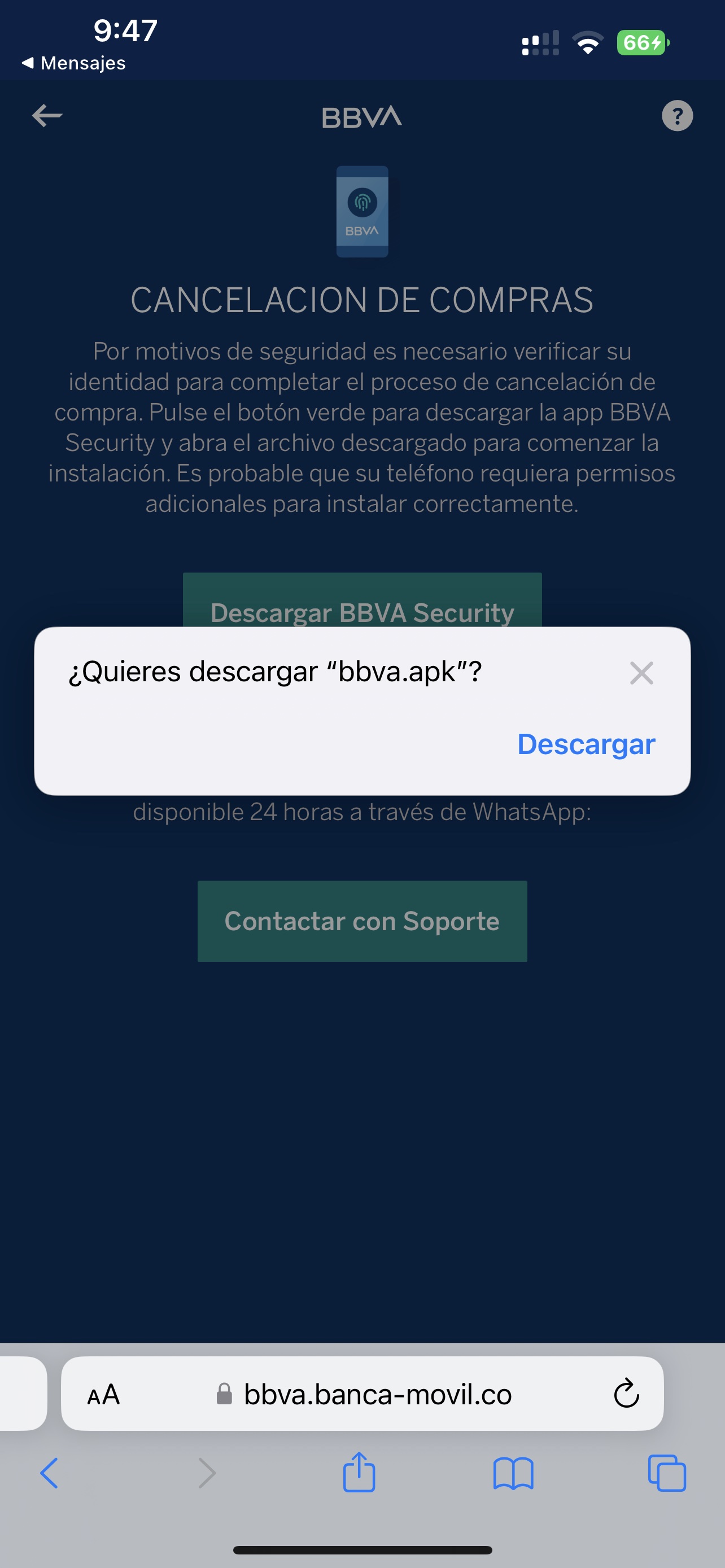 Se puede apreciar en ambas capturas que hemos realizado, la primera de ellas nos muestra la web para móviles del banco, para automáticamente, la solicitud de descarga de una apk. Esto no es más que un programa, en este caso malicioso y que solo funciona en Android, que lo que va a hacer es tomar la puerta trasera con tus credenciales y vaciar tu cuenta corriente. Por tanto, no lo hagas.