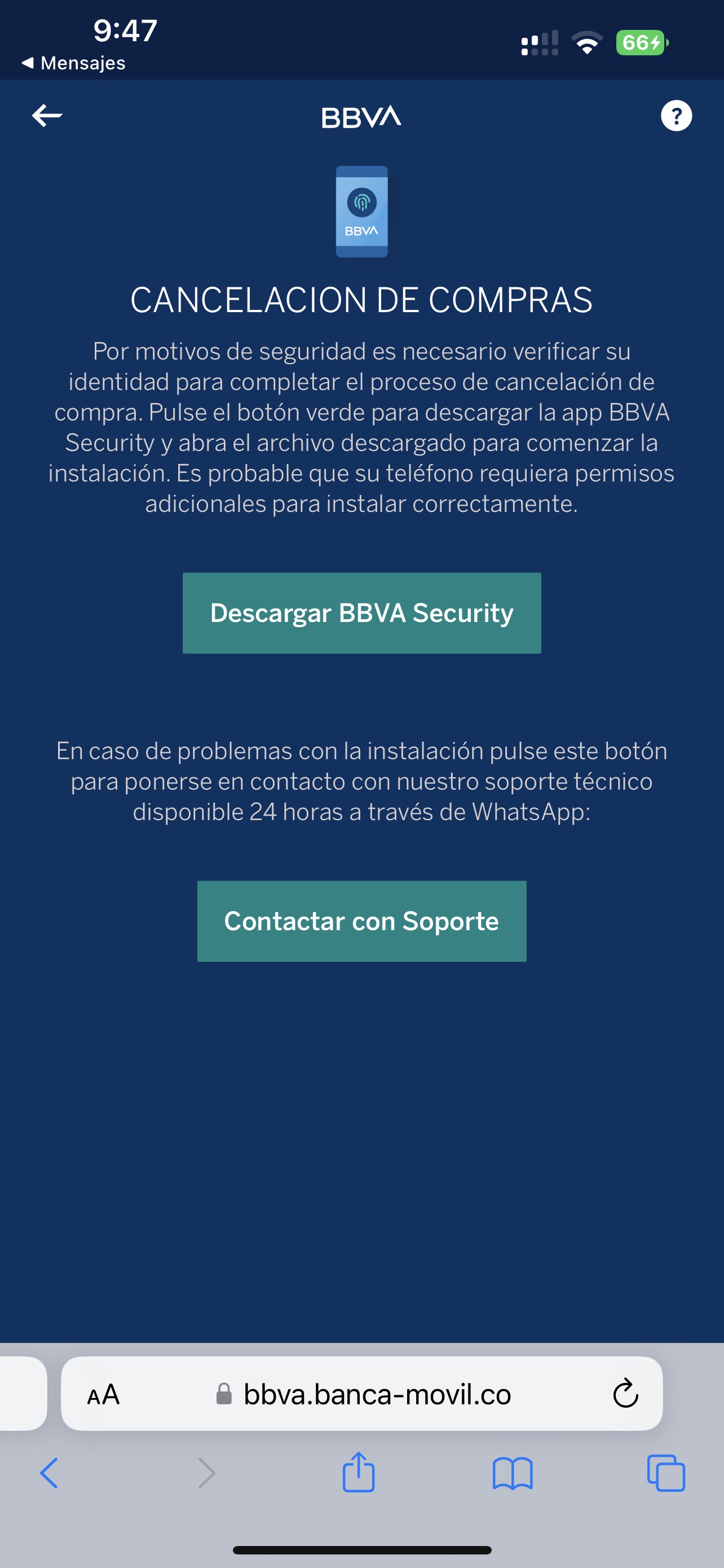 «Compra aceptada por importe de 986.45 euros. Si no ha sido usted siga los pasos en este enlace para cancelarla: bbva.banca-movil.co»
