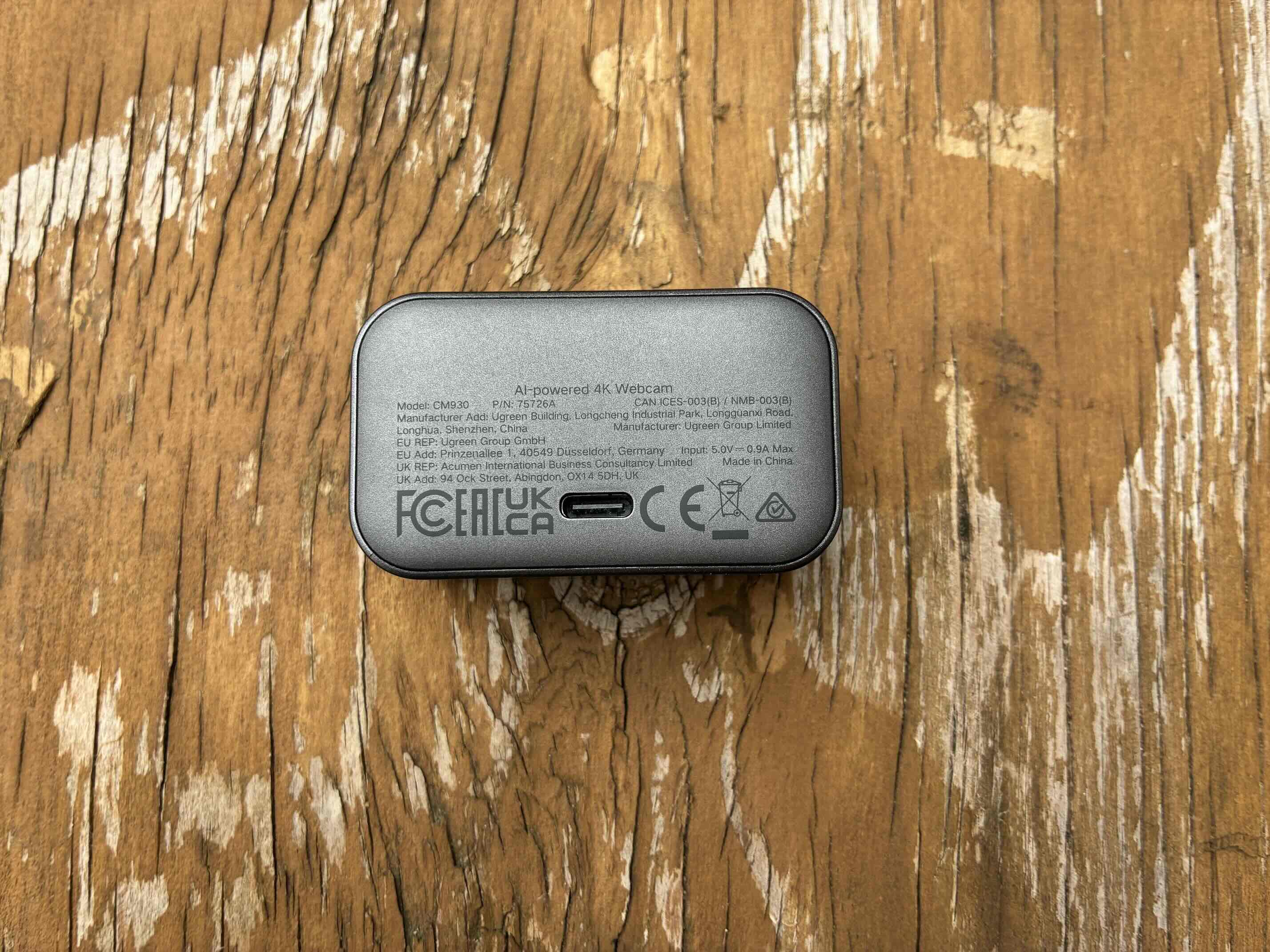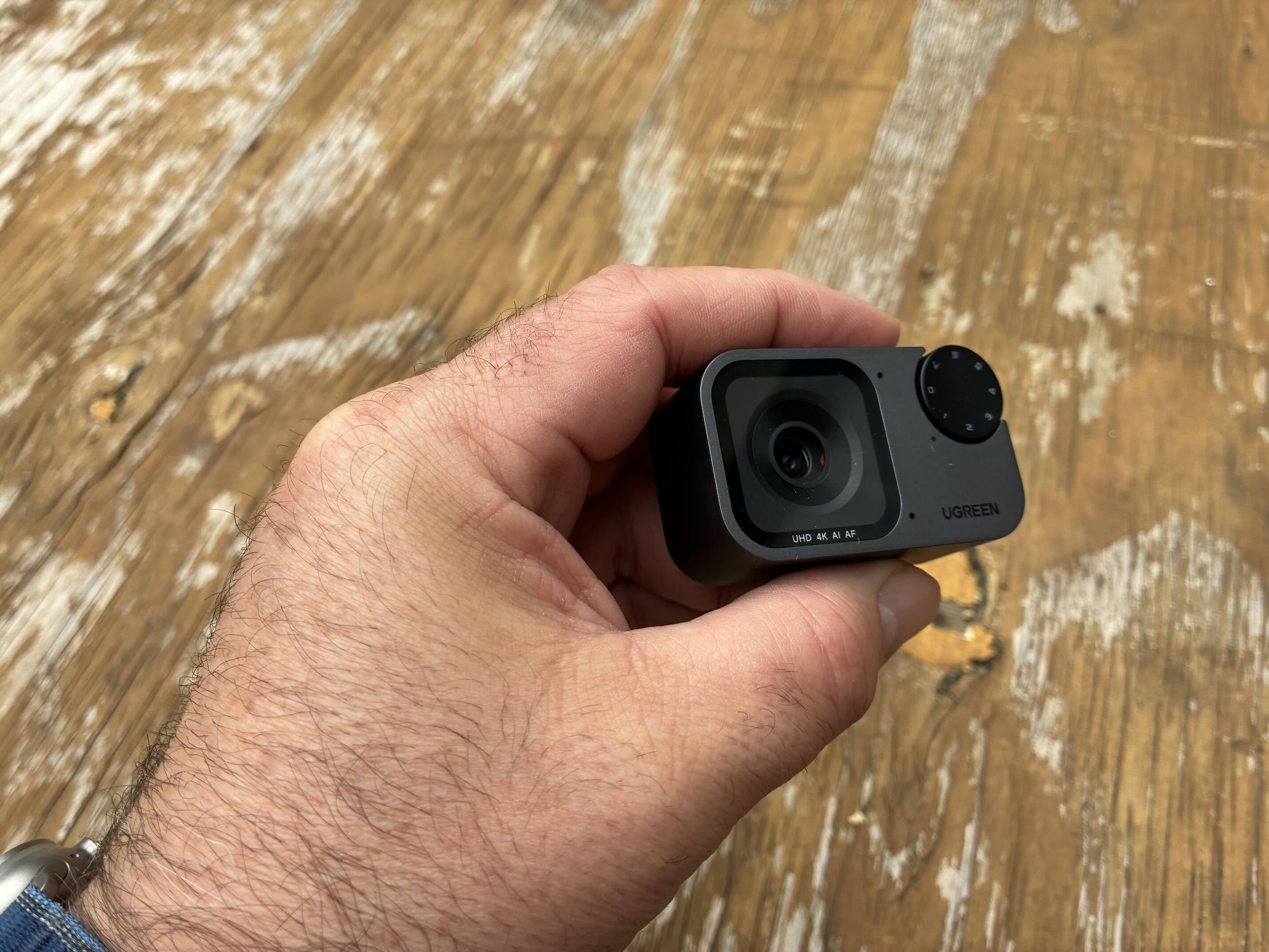 Lo primero que salta a la vista es su estética. Lejos de las típicas webcams ovaladas, esta UGREEN hereda el formato de las cámaras de acción: cuadrada, resistente y con un cuerpo gris oscuro que se sota sólido al tacto. No busca ser el centro de atención en tu escritorio, pero su construcción transmite esa durabilidad que esperas en un accesorio de uso diario.