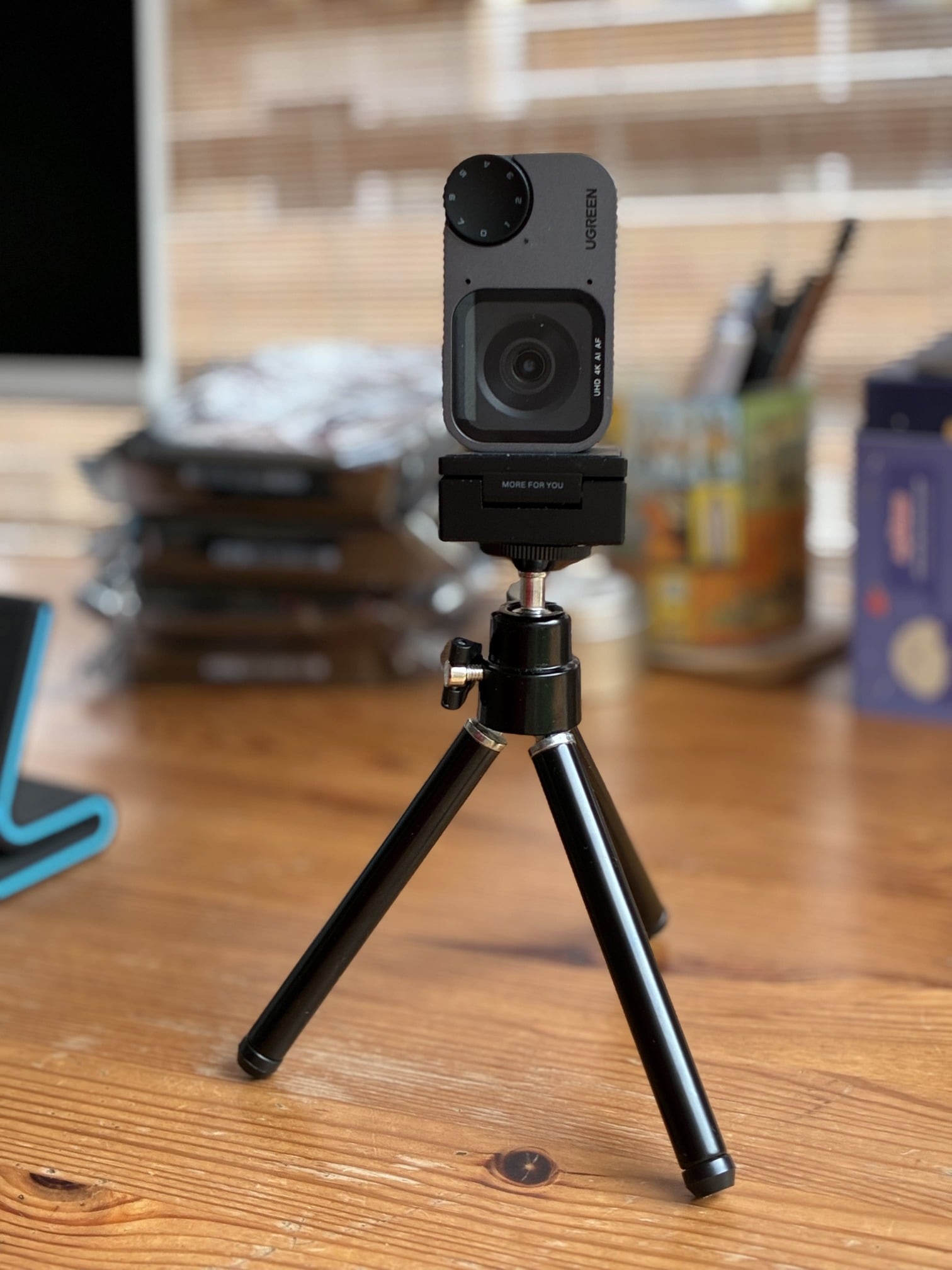 Para colocarla, incluye un soporte magnético que muerde con firmeza el monitor y permite inclinarla sin miedo a que se desplace. Además, viene con un mini trípode, ideal si prefieres un encuadre lateral o trabajas desde la mesa.