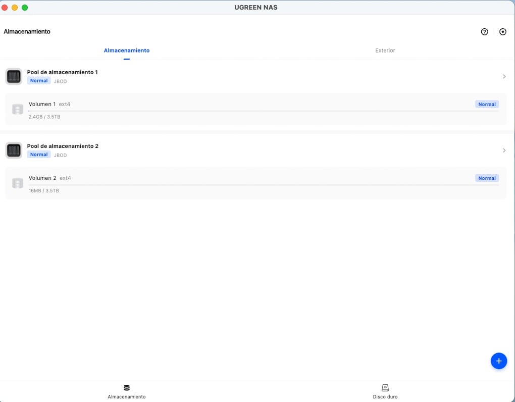 Monté los dos discos duros SATA y lo conecté por Ethernet al router. En cuestión de minutos ya estaba accediendo al panel de control desde el navegador. La configuración inicial es guiada y clara, incluso si nunca has usado un NAS antes.
