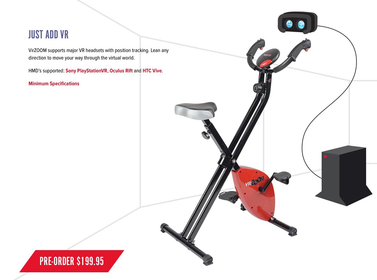 El planteamiento es similar al que han propuesto otras tecnologías como Kinect en las consolas Xbox y similares y se trata de que la actividad física se mezcle con el juego de modo que te resulte lo más divertido posible. La novedad es, por supuesto el hecho de que los juegos han sido creados para usar con gafas de realidad virtual. La bicicleta estática se conecta a la consola o el ordenador mediante Bluetooth y de momento es compatible con la PlayStation 4 y con ordenadores con sistema gráfico Nvidia GTX 970 o AMD 290, procesador Intel i5-4590 (o superior) y un mínimo de and 8 GB de RAM.