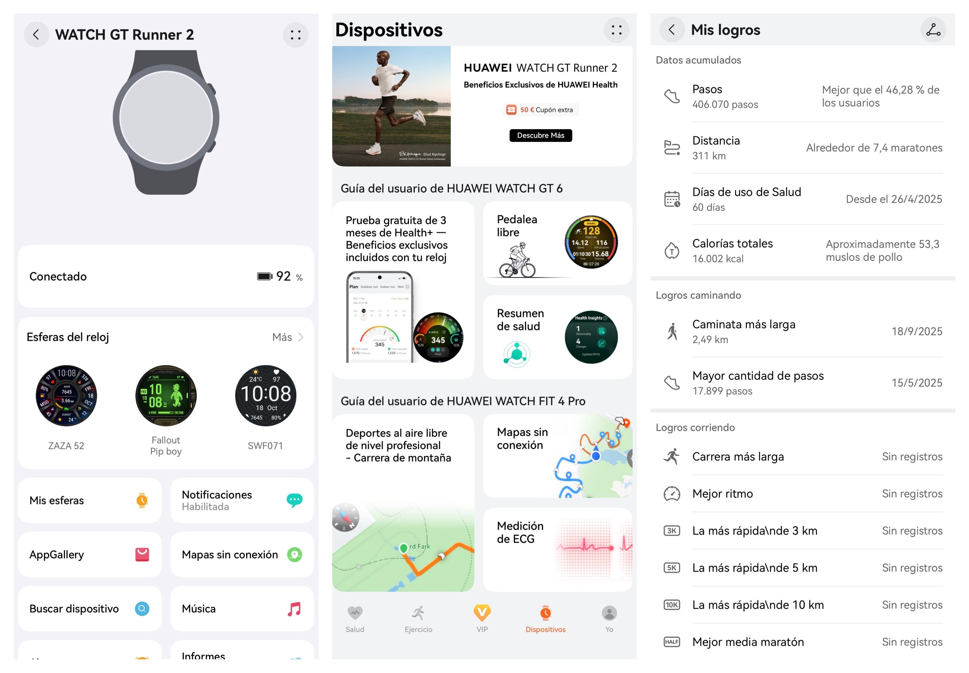 Aunque mi historial de running esté en blanco, este reloj ha demostrado ser un compañero de salud excepcional en el día a día. Mi aplicación refleja más de 400.000 pasos y más de 300 kilómetros acumulados recientemente a base de largas caminatas.