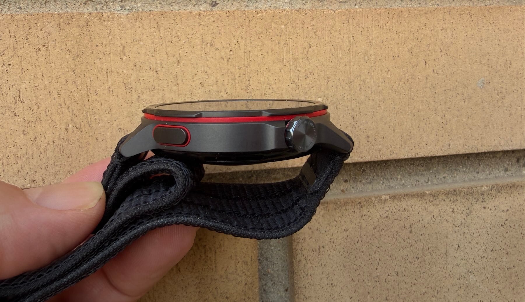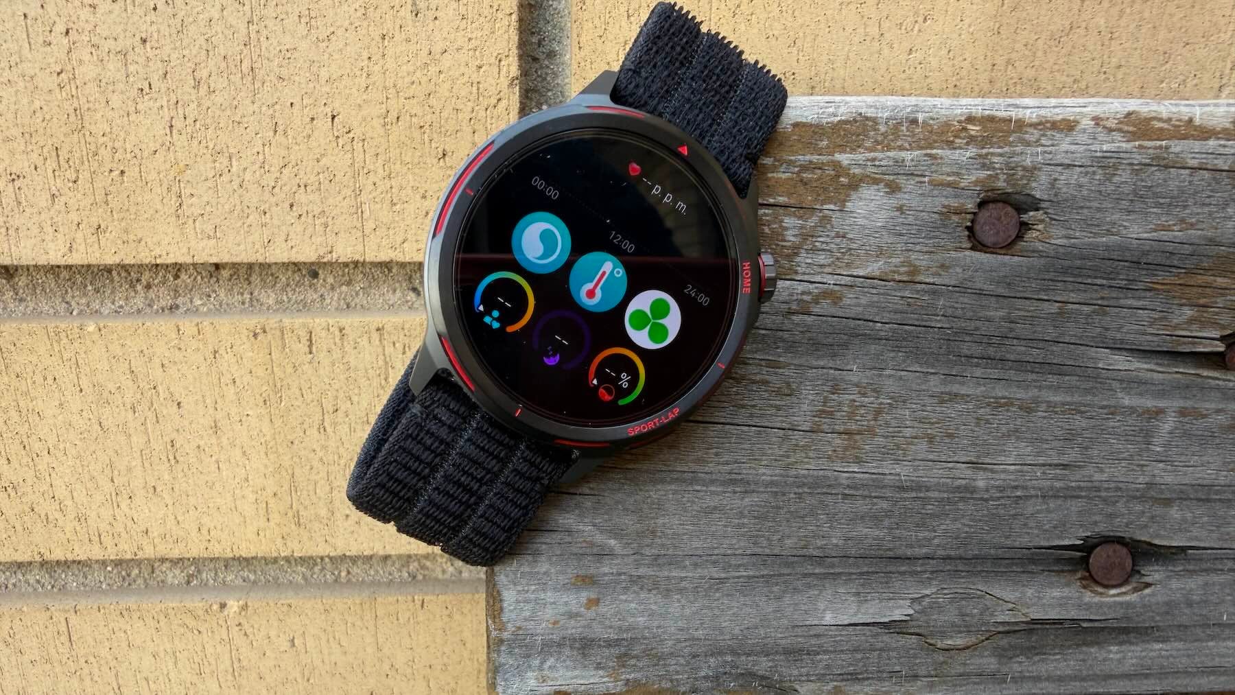 Mención especial merece su correa de nailon trenzado con ajuste tipo velcro. Es, sin exagerar, una de las soluciones más cómodas y transpirables que puedes llevar. Da igual si lo dejo posando para la foto sobre mis viejas zapatillas de running, que ahora solo uso para paseos tranquilos, o si lo llevo puesto todo el día; apenas notas que está ahí. La interacción física se resuelve de manera excelente con una corona giratoria y un botón inferior, perfectos para cuando tienes las manos sudadas y la pantalla táctil no es la mejor opción.