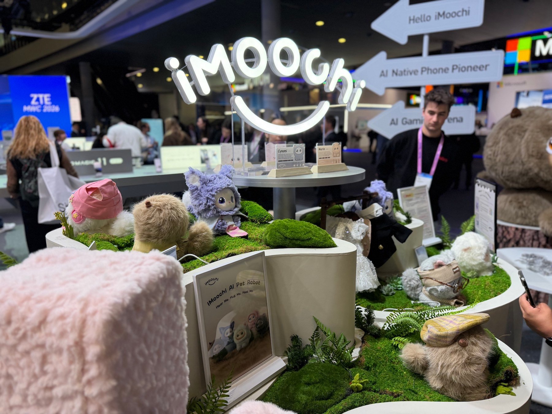 R.- Tenemos nuestros mejores modelos, como RedMagic número 1 en Antutu, pero lo que más llama la atención es la mascota IMOOCHI. Es una mascota virtual que detecta emociones e interactúa durante el día. Reconoce la voz de su dueño y puede detectar si estás más triste o más tranquilo. Tiene zonas de toque y responde de diferentes formas. A lo largo del día va escribiendo un diario y por la noche envía un resumen al móvil. Tiene siete personajes con distintas personalidades y se lanza en China el mes que viene en torno a los 350 euros. Aunque parece un producto infantil, hay un boom entre personas de 20, 30, 40 o 50 años que la usan incluso en su setup de trabajo.