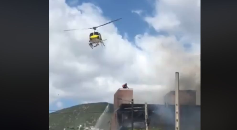 El helicóptero de emergencias es el único que puede rescatar a los trabajadores de la azotea. Lo vemos que intenta una aproximación desde el aire. En este vídeo se aprecia que lo que debe hacer el piloto no es nada fácil, no dispone de ninguna herramienta, ni cuerdas, ni arneses, ni camillas para hacer llegar a los hombres, la única opción es que suban ellos mismos al vehículo.