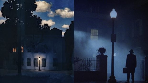 Cuando pensamos en El exorcista, lo primero que se nos viene a la cabeza es uno de sus planos más icónicos (también su cartel promocional). En la imagen, el reverendo se encuentra entre las sombras a la entrada de la casa de Linda Blair. Mientras, de la habitación de la joven se proyecta una potente luz. Lo que mucha gente no sabe es que la escena está inspirada en los cuadros de René Magritte, L’Empire des Lumières.