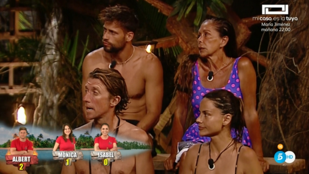 Isabel nominó entre lágrimas -por su hijo, no por nominar- a Albert, que se había condenado solo horas antes al asegurar que su grupo no hace nada en la isla y pescan de mala gana. Le siguió Albert, que curiosamente no recibió llamada desde plató, ni ninguno de sus compañeros de ‘Supervivientes 2019’, aunque recibió el ánimo de Jorge Javier Vázquez, antes de nominar a Mónica.