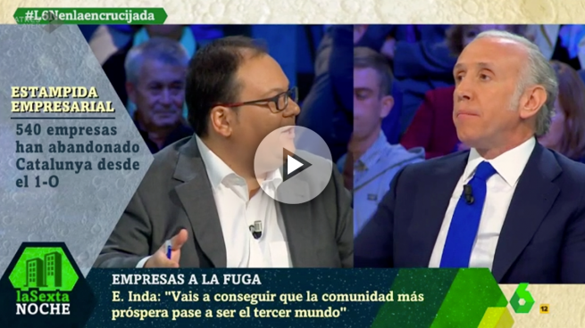 Eduardo Inda ha denunciado esta noche en La Sexta que el golpe de Estado de Puigdemont está provocando la fuga masiva de grandes empresas de Cataluña: «Hasta Aguas de Barcelona (Agbar) ha trasladado su sede a Madrid», ha comentado.