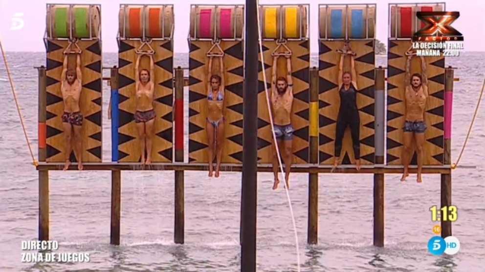 La prueba ha sido bastante difícil. Los concursantes tenían que aguantar su propio peso en una tabla mientras les caía agua. No todos han podido resistir. Raquel ha sido la primera en caer al agua, por lo que, además, es la que menos jamón ha podido comer. El siguiente en caer ha sido Hugo y luego Logan, para sorpresa de todos.