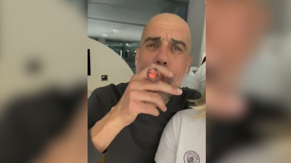 Guardiola la lía en la fiesta del City: aparece desbocado fumándose un puro enorme