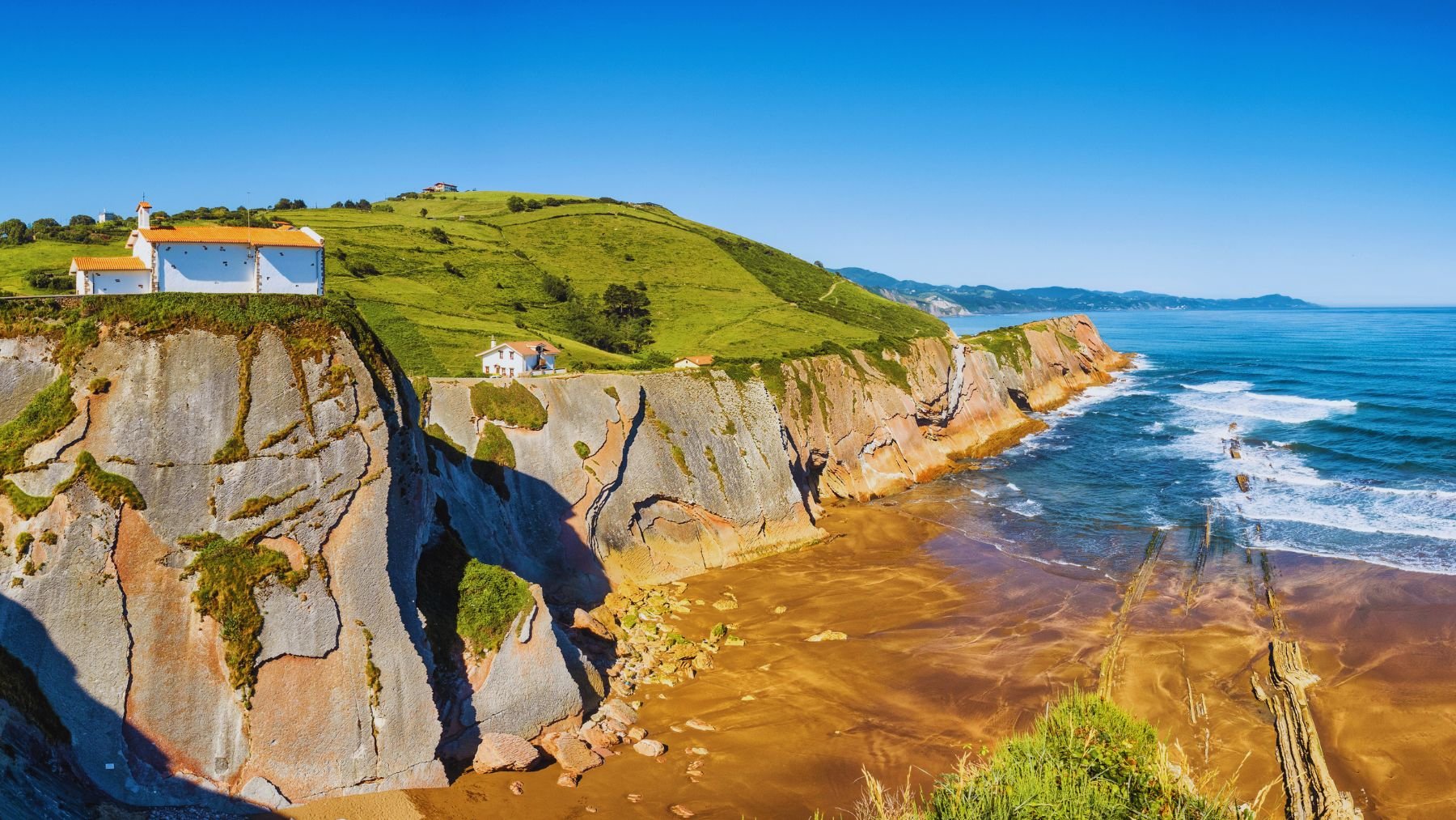 La playa de Itzurun, situada en Zumaia, es parte de uno de los tramos más increíbles del litoral de Guipúzcoa. Sus imponentes acantilados verticales, que alcanzan alturas de hasta 150 metros y se componen principalmente de piedra caliza, son uno de los ejemplos más destacados de la formación geológica conocida como flysch. Este fenómeno ha sido moldeado a lo largo de miles de años por la acción erosiva del mar, creando un paisaje fascinante que atrae a miles de visitantes cada año. La playa de Itzurun, enmarcada por estos magníficos acantilados, tiene una extensión de 270 metros y se caracteriza por la fina arena dorada.