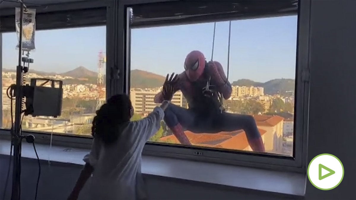 Spiderman se ha desplazado hasta Málaga para felicitar la Navidad a los niños del hospital. Se ha descolgado por la fachada del edificio saludando a los niños en cada planta.